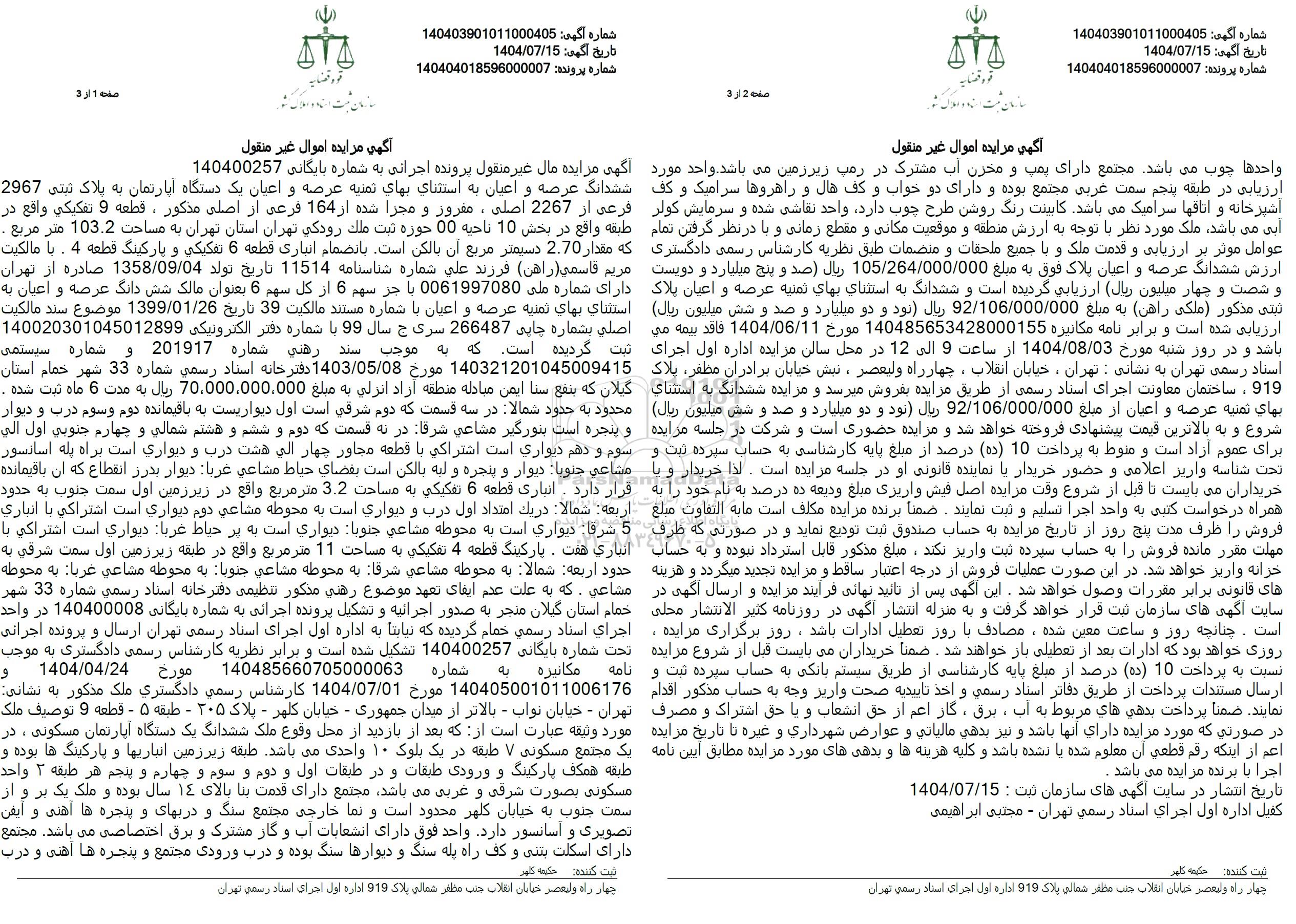 آگهی مزایده مال غیر منقول پرونده اجرائی به شماره بایگانی 140400257 ششدانگ عرصه و اعیان به استثنای بهای تمنیه عرصه و اعیان یک دستگاه آپارتمان به پلاک ثبتی 2967 فرعی از 2267 اصلی، مفروز و مجزا شده از 164 فرعی از اصلی مذکور، قطعه 9 تفکیکی واقع در طبقه واقع در بخش 10 ناحیه 00 حوزه ثبت ملک رودکی تهران استان تهران به مساحت 103.2 متر مربع . که مقدار 2.70 دسیمتر مربع آن بالکن است. بانضمام انباری قطعه 6 تفکیکی و پارکینگ قطعه 4 . با مالکیت مریم قاسمی (راهن) فرزند علی شماره شناسنامه 11514 تاریخ تولد 1358.09.04 صادره از تهران دارای شماره ملی 0061997080 با جز سهم 6 از کل سهم 6 بعنوان مالک شش دانگ عرصه و اعیان به استثنای بهای تمنیه عرصه و اعیان با شماره مستند مالکیت 39 تاریخ 1399.01.26 موضوع سند مالکیت اصلی بشماره چاپی 266487 سری ج سال 99 با شماره دفتر الکترونیکی 140020301045012899 ثبت گردیده است. که به موجب سند رهنی شماره 201917 و شماره سیستمی 140321201045009415 مورخ 1403.05.08 دفترخانه اسناد رسمی شماره 33 شهر خمام استان گیلان که ینفع سنا ایمن مبادله منطقه آزاد انزلی به مبلغ 70,000,000,000 ریال به مدت 6 ماه ثبت شده . محدود به حدود شمالا در سه قسمت که دوم شرقی است اول دیواریست به باقیمانده دوم و سوم درب و دیوار و پنجره است بنورگیر مشاعی شرفا در نه قسمت که دوم و ششم و هشتم شمالی و چهارم جنوبی اول الی سوم و دهم دیواری است اشتراکی با قطعه مجاور چهار الی هشت درب و دیواری است براه پله اسانسور مشاعی جنوبا دیوار و پنجره و لبه بالکن است بقضای حیاط مشاعی غربا دیوار بدرز انقطاع که آن باقیمانده قرار دارد. انباری قطعه 6 تفکیکی به مساحت 3.2 متر مربع واقع در زیرزمین اول سمت جنوب به حدود اربعه شمالا در یک امتداد اول درب و دیواری است به محوطه مشاعی دوم دیواری است اشتراکی با انباری 5 شرقا دیواری است به محوطه مشاعی جنوبا دیواری است به پر حیاط غربا دیواری است اشتراکی با انباری هفت . پارکینگ قطعه 4 تفکیکی به مساحت 11 متر مربع واقع در طبقه زیرزمین اول سمت شرقی به حدود اربعه شمالا به محوطه مشاعی شرقا به محوطه مشاعی جنوبا به محوطه مشاعی غربا به محوطه مشاعی که به علت عدم ایفای تعهد موضوع رهنی مذکور تنظیمی دفترخانه اسناد رسمی شماره 33 شهر حمام استان گیلان منجر به صدور اجرائیه و تشکیل پرونده اجرائی به شماره بایگانی 140400008 در واحد اجرای اسناد رسمی حمام گردیده که نیابتا به اداره اول اجرای اسناد رسمی تهران ارسال و پرونده اجرائی تحت شماره بایگانی 140400257 تشکیل شده است و برابر نظریه کارشناس رسمی دادگستری به موجب نامه مکانیزه شماره مورخ به 140485660705000063 مورخ 1404.4.24 و 140405001011006176 مورخ 1404.07.01 کارشناس رسمی دادگستری ملک مذکور به نشانی تهران - خیابان نواب - بالاتر از میدان جمهوری - خیابان کلهر - پلاک 205 - طبقه 5 - قطعه 9 توصیف ملک مورد وثیقه عبارت است از که بعد از بازدید از محل وقوع ملک ششدانگ یک دستگاه آپارتمان مسکونی ، در یک مجتمع مسکونی 7 طبقه در یک بلوک 10 واحدی می باشد. طبقه زیرزمین انباریها و پارکینگ ها بوده و طبقه همکف پارکینگ و ورودی طبقات و در طبقات اول و دوم و سوم و چهارم و پنجم هر طبقه 3 واحد مسکونی بصورت شرقی و غربی میباشد مجتمع دارای قدمت بنا بالای 14 سال بوده و ملک یک بر و از سمت جنوب به خیابان کلهر محدود است و نما خارجی مجتمع سنگ و دربهای و پنجره ها آهنی و ایمن تصویری و آسانسور دارد واحد فوق دارای انشعابات آب و گاز مشترک و برق اختصاصی می باشد. مجتمع دارای اسکلت بتنی و کف راه پله سنگ و دیوارها سنگ بوده و درب ورودی مجتمع و پنجره ها آهنی و درب واحدها چوب می باشد مجتمع دارای پمپ و مخزن آب مشترک در رمپ زیرزمین می باشد. واحد مورد ارزیابی در طبقه پنجم سمت غربی مجتمع بوده و دارای دو خواب و کف هال و راهروها سرامیک و کف آشپزخانه و اتاقها سرامیک میباشد کابینت رنگ روشن طرح چوب دارد واحد نقاشی شده و سرمایش کولر آبی میباشد ملک مورد نظر با توجه به ارزش منطقه و موقعیت مکانی و مقطع زمانی و با در نظر گرفتن تمام عوامل موثر بر ارزیابی و قدمت ملک و با 