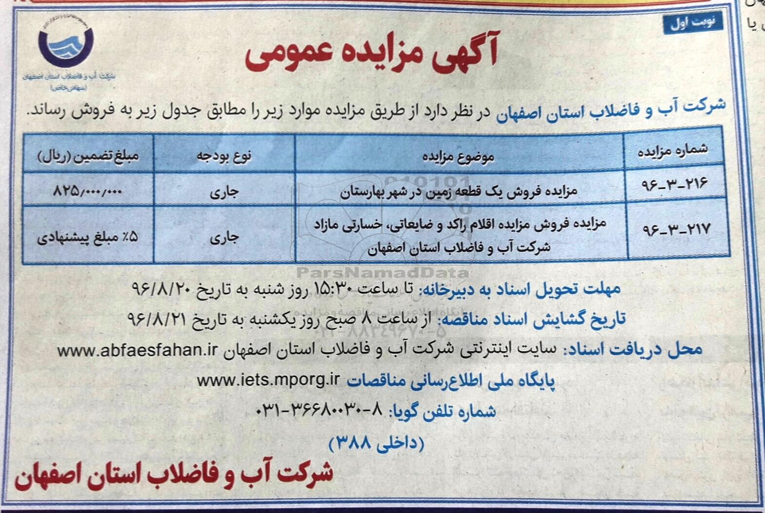 96-3-217 مزایده فروش مزایده اقلام راکد و ضایعاتی ، خسارتی مازاد شرکت آب و فاضلاب استان اصفهان