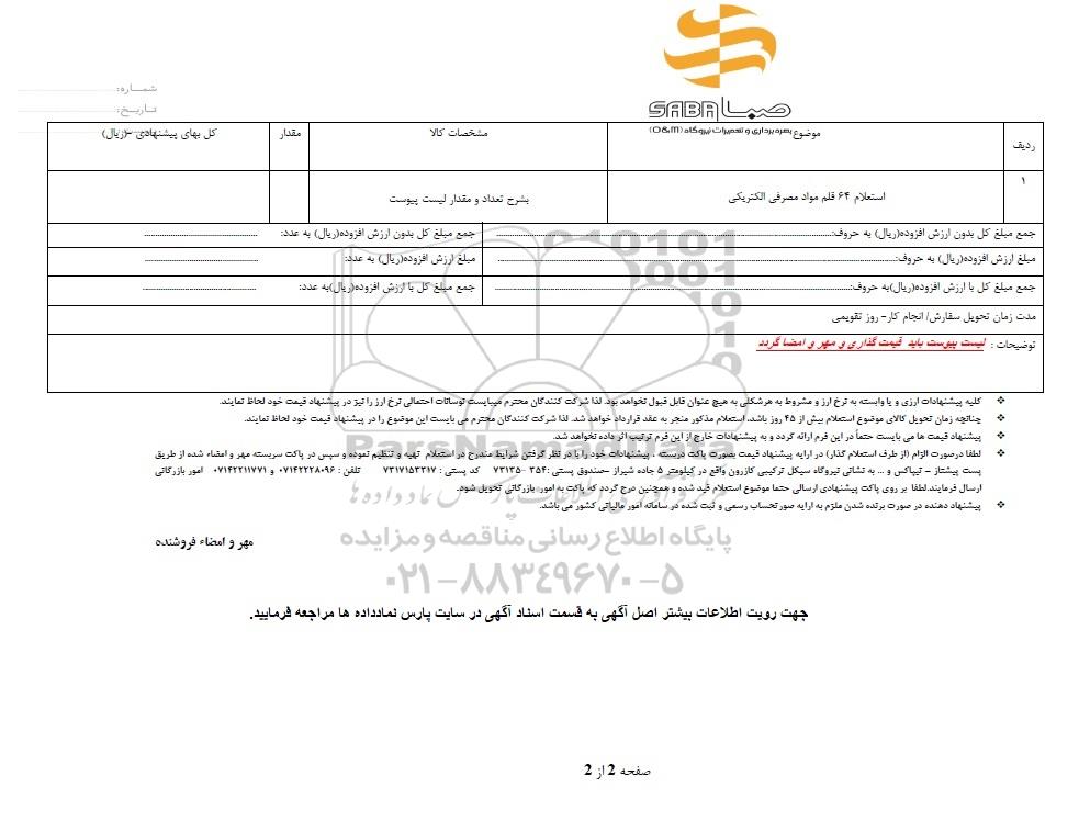 | 1 | استعلام 64 قلم مواد مصرفی الکتریکی | به شرح تعداد و مقدار لیست پیوست |