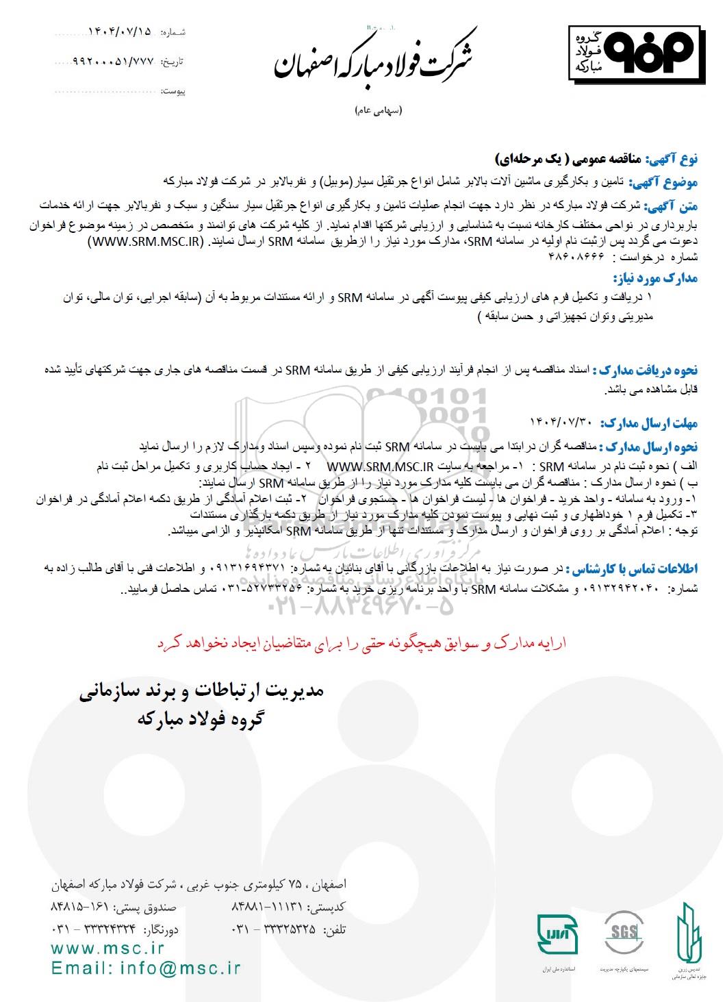 موضوع آگهی: تامین و بکارگیری ماشین آلات بالابر شامل انواع جرثقیل سیار (موبیل) و نفر بالابر در شرکت فولاد مبارکه