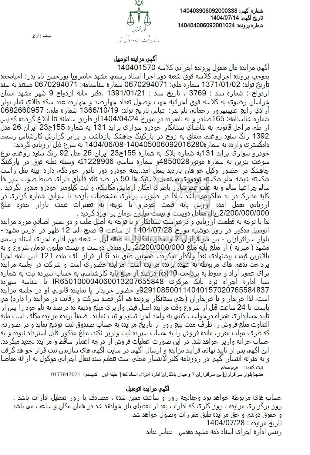 لذا با توجه به قطعیت ارزیابی و درخواست بستانکار و با توجه به اصل طلب و دو عشر اضافي مورد مزایده اتومبیل مذکور در روز دوشنبه مورخ 1404.07.28 از ساعت 9 صبح الى 12 ظهر در ادرس مشهد -بلوار سرافرازان - بین سرافرازان 7 و میدان یادگاران - طبقه اول - شعبه دوم اداره اجرای اسناد رسمی مشهد ) مهریه ( از مبلغ پایه مبلغ 2.200.000.000 ريال معادل دویست و بیست میلیون تومان شروع و به بالاترین قیمت پیشنهادی نقداً واگذار میگردد. همچنین طبق بند 6 از فراز الف ماده 121 آیین نامه اجرا پرداخت بدهیهای مربوطه به عهده برنده مزایده است. مزایده حضوری است و شرکت در جلسه مزایده برای عموم آزاد و منوط به پرداخت (10 (ده) درصد از مبلغ پایه کارشناسی به حساب سپرده ثبت به شماره با شناسه سپرده IR650100004060013207655848 شبا اداره اجراء نزد بانک مرکزی 929108500114040157020765584837 و حضور خریدار یا نماینده قانوني او در جلسه مزایده است، لذا خریدار و یا یا خریداران حتی بستانکار پرونده هم اگر قصد شرکت و رقابت در مزایده را دارد می بایست تا 24 ساعت قبل از شروع وقت مزایده اصل فیش واريزي مبلغ ودیعه ده درصد به نام خود را پس از تایید حسابداری همراه درخواست کتبی به واحد اجرا تسلیم و ثبت نمایند. ضمناً برنده مزایده مکلف است ما به التفاوت مبلغ فروش را ظرف مدت پنج روز از تاریخ مزایده به حساب صندوق ثبت تودیع نماید و در صورتي که ظرف مهلت مقرر مانده فروش را به حساب سپرده ثبت واریز نکند مبلغ مذکور قابل استرداد نبوده و به حساب خزانه واریز خواهد شد. در این صورت عملیات فروش از درجه اعتبار ساقط و مزایده تجدید میگردد. این آگهی پس از تایید نهایی فرآیند مزایده و ارسال آگهی در سایت آگهی های سازمان ثبت قرار خواهد گرفت و به منزله انتشار آگهی در روزنامه کثیر الانتشار محلی است تنظیم سند انتقال اجرایی موکول به ارائه مفاصا