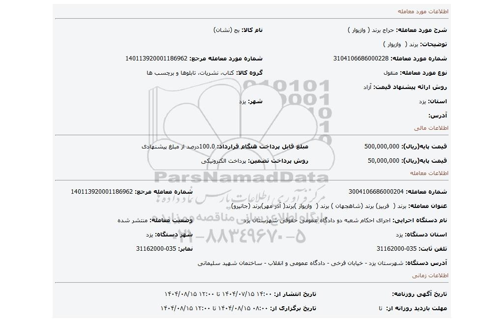 مزایده عمومی مزایده برند (  وازیوار ) برگزار میگردد. از کلیه افراد متخصص و شرکت‌های واجد شرایط دعوت به عمل می‌آید تا در این مزایده با کد خبرگزاری پارس نماد : 9662904 شرکت نمایند تاریخ شروع مزایده : 1404/07/15 مهلت شرکت در مزایده: تا پایان روز 1404/08/15 مکان برگزاری اموال واگذاری استان‌های یزد و دسته‌بندی‌های مربوط به این حراجی متفرقه میباشد.