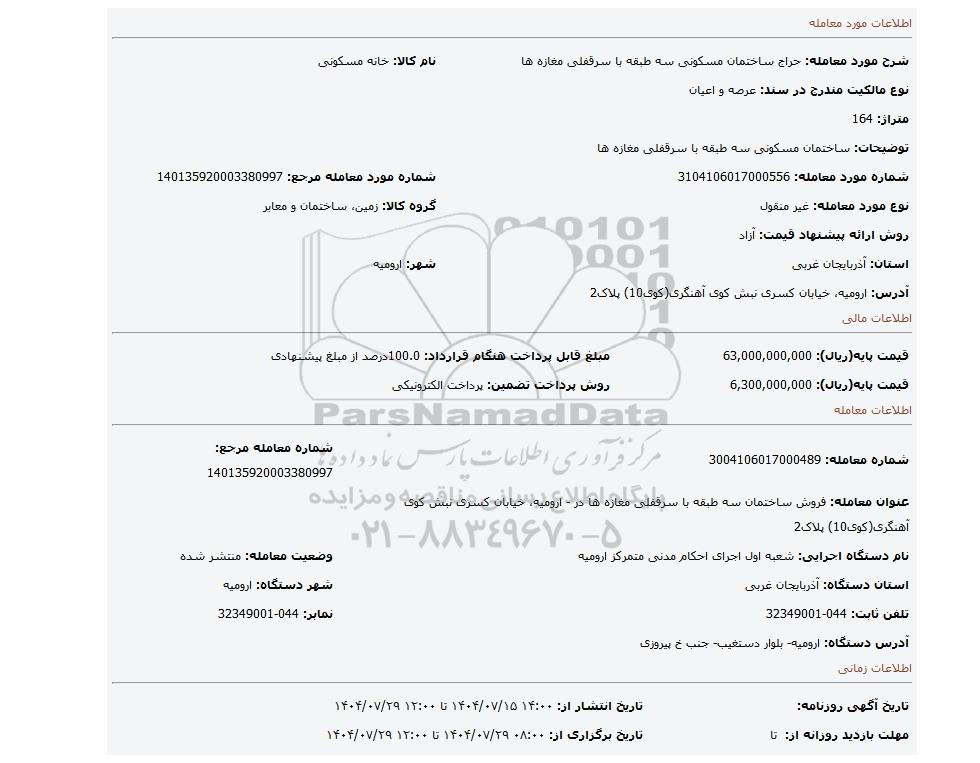 مزایده عمومی مزایده ساختمان مسکونی سه طبقه با سرقفلی مغازه ها برگزار میگردد. از کلیه افراد متخصص و شرکتهای واجد شرایط دعوت به عمل میآید تا در این مزایده با کد خبرگزاری پارس نماد : 9662931 شرکت نمایند تاریخ شروع مزایده : 1404/07/15 مهلت شرکت در مزایده: تا پایان روز 1404/07/29 مکان برگزاری اموال واگذاری استانهای آذربایجان غربی و دستهبندیهای مربوط به این حراجی املاک و زمین میباشد.