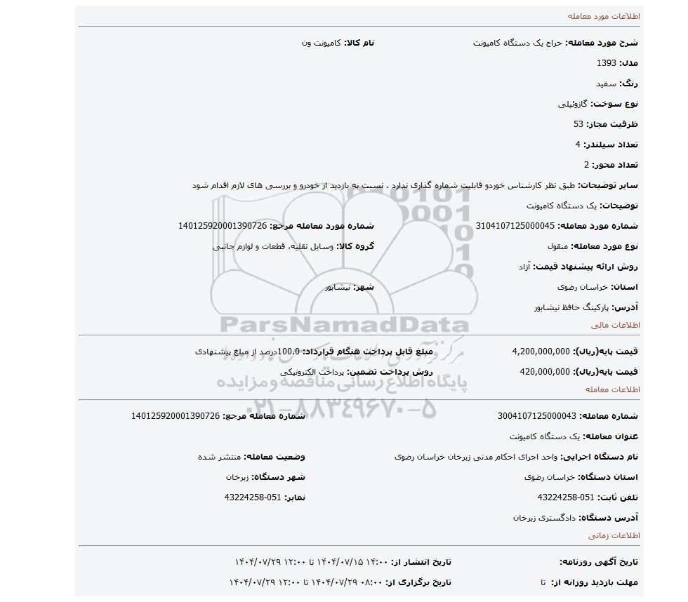 | نوع مورد معامله: منقول | گروه کالا: وسایل نقلیه، قطعات و لوازم جانبی | |