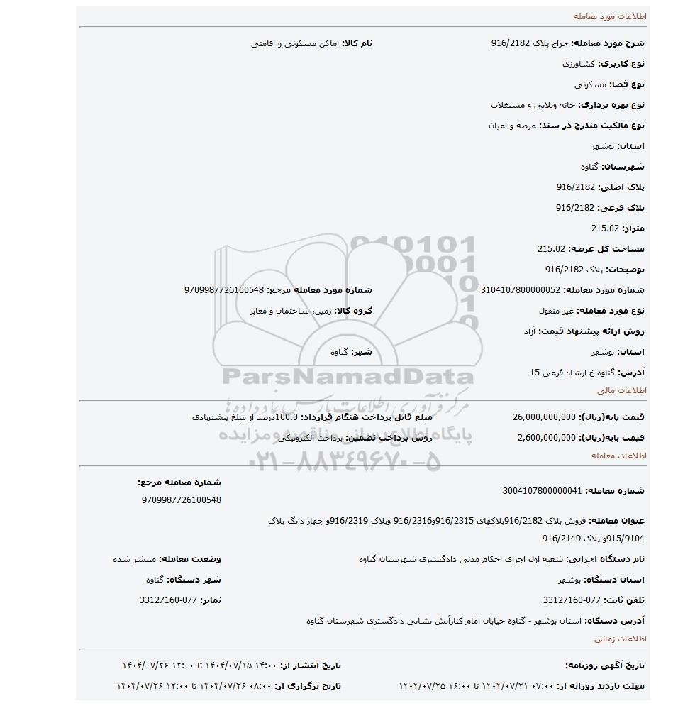 مزایده پلاک 916/2182, مزایده، پلاک 916/2182