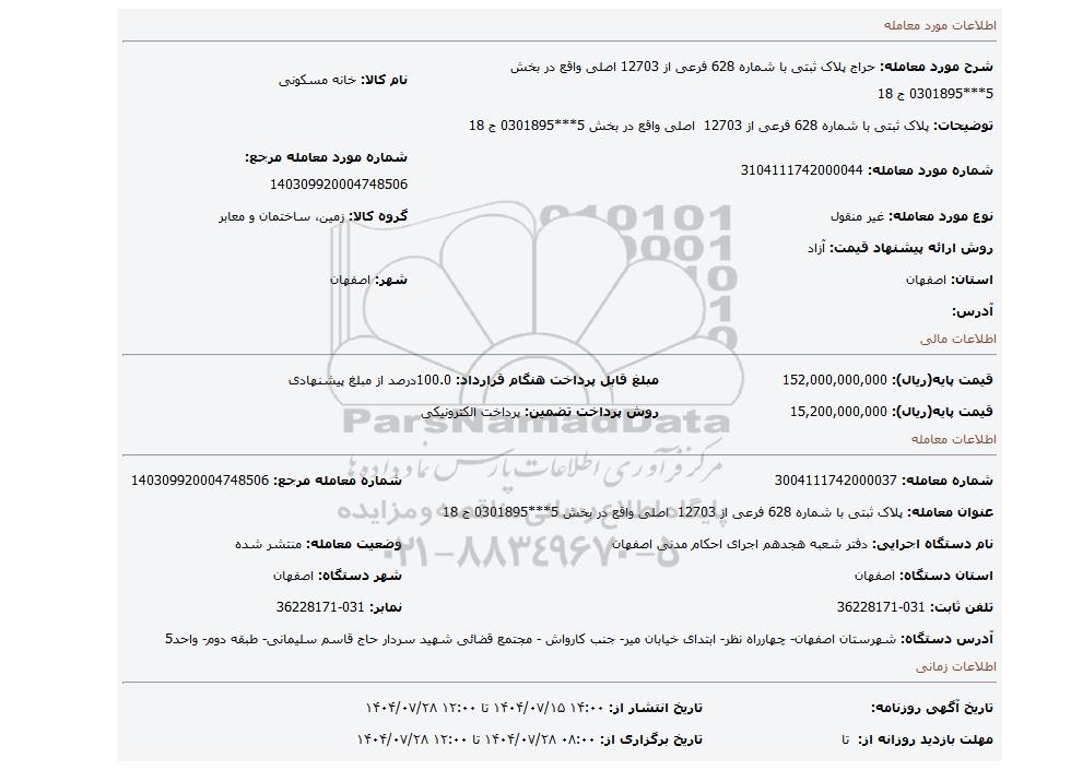 | شرح مورد معامله: حراج پلاک ثبتی با شماره 628 فرعی از 12703 اصلی واقع در بخش 5***0301895 ج 18 | نام کالا: خانه مسکونی | |