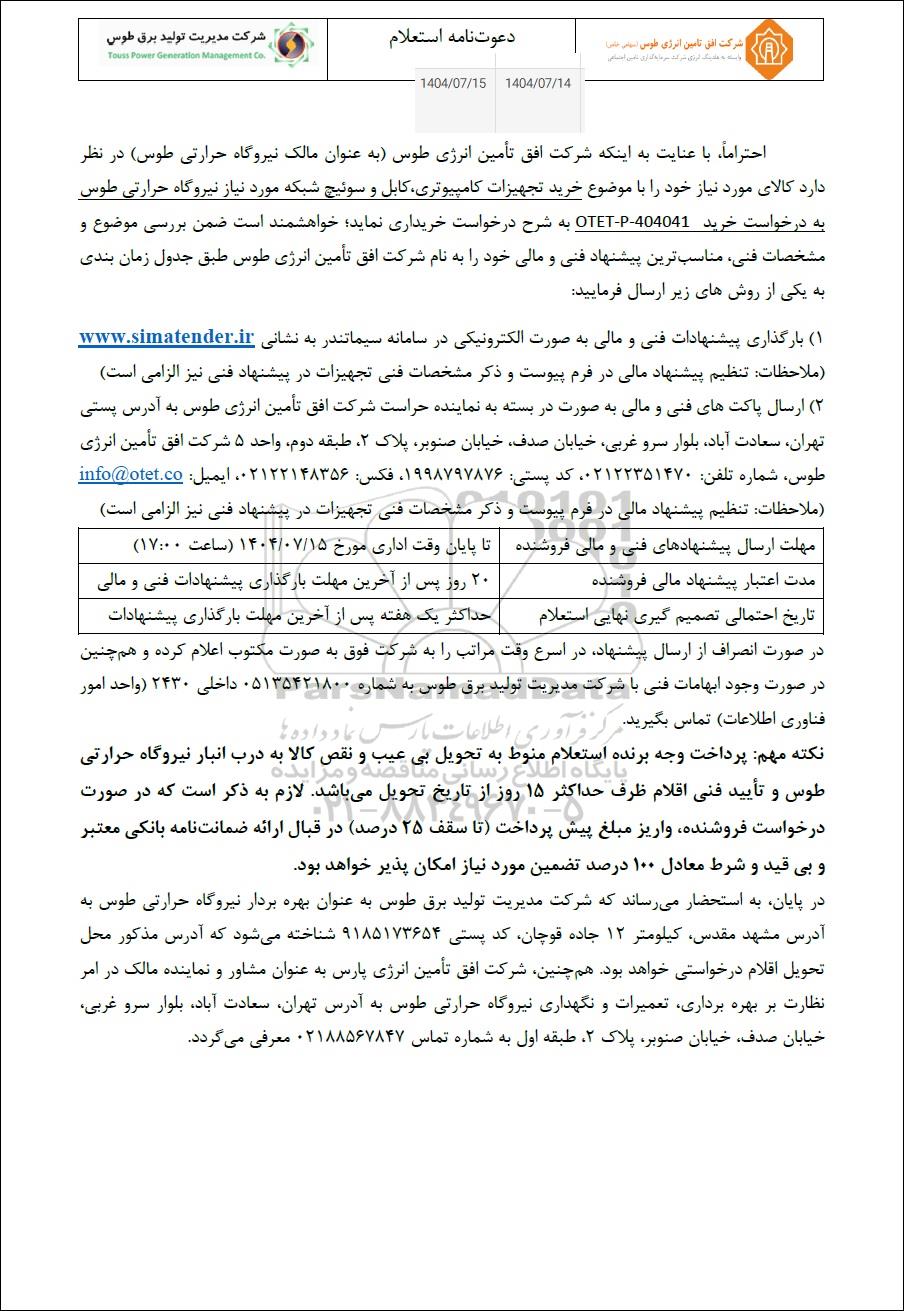 احتراماً ، با عنایت به اینکه شرکت افق تأمین انرژی طوس (به عنوان مالک نیروگاه حرارتی طوس) در نظر دارد کالای مورد نیاز خود را با موضوع خرید تجهیزات کامپیوتری، کابل و سوئیچ شبکه مورد نیاز نیروگاه حرارتی طوس به درخواست خرید 404041-OTET-P به شرح درخواست خریداری نماید؛ خواهشمند است ضمن بررسی موضوع و مشخصات فنی، مناسب ترین پیشنهاد فنی و مالی خود را به نام شرکت افق تأمین انرژی طوس طبق جدول زمان بندی به یکی از روش های زیر ارسال فرمایید: