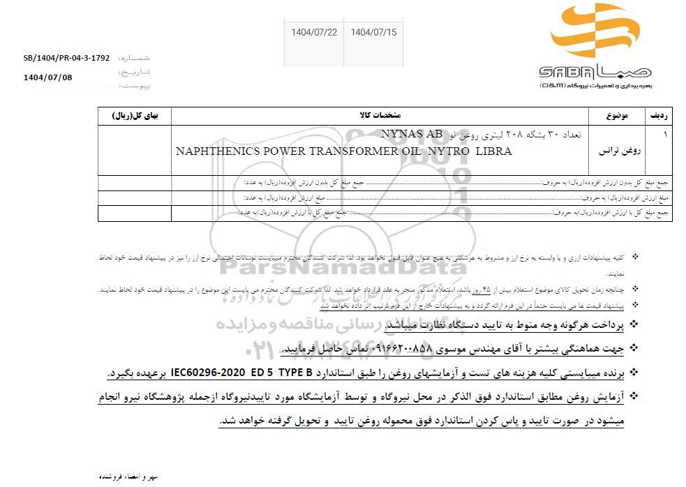 استعلام تعداد 30 بشکه 208 لیتری روغن نو NYNAS AB ..., استعلام تعداد 30 بشکه 208 لیتری روغن نو NYNAS AB ...