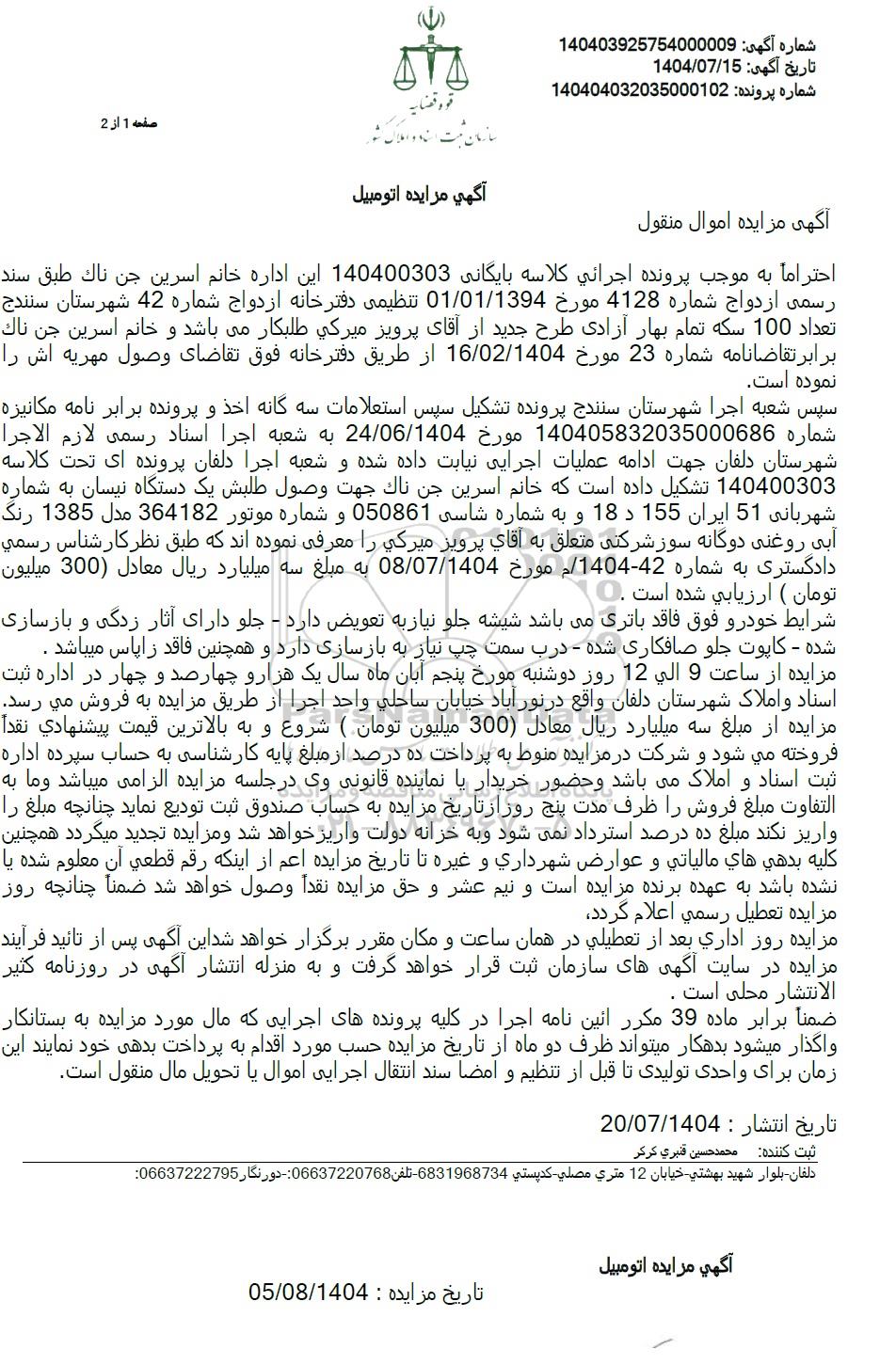 سپس شعبه اجرا شهرستان سنندج پرونده تشکیل سپس استعلامات سه گانه اخذ و پرونده برابر نامه مکانیزه شماره 140405832035000686 مورخ 1404.06.24 به شعبه اجرا اسناد رسمی لازم الاجرا شهرستان دلفان جهت ادامه عملیات اجرایی نیابت داده شده و شعبه اجرا دلفان پرونده ای تحت کلاسه 140400303 تشکیل داده است که خانم اسرین جن ناک جهت وصول طلبش یک دستگاه نیسان به شماره شهربانی 51 ایران 155 د 18 و به شماره شاسی 050861 و شماره موتور 364182 مدل 1385 رنگ آبی روغنی دوگانه سوز شرکتی متعلق به آقای پرویز میرکی را معرفی نموده اند که طبق نظر کارشناس رسمی دادگستری به شماره 42-1404/م مورخ 1404.07.08 به مبلغ سه میلیارد ریال معادل 300 میلیون تومان ) ارزیابی شده است .