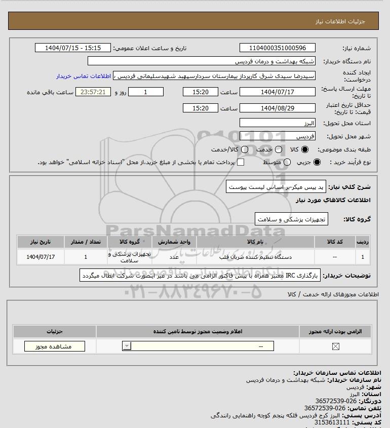 | 1 | -- | دستگاه تنظیم کننده ضربان قلب | عدد | تجهیزات پزشکی و سلامت | 1 | 1404/07/17 |