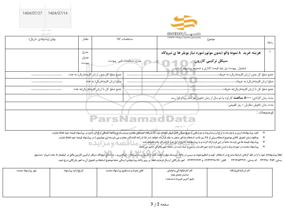 هزینه خرید 8 نمونه والو (بدون موتور) مورد نیاز بویلرهای نیروگاه سیکل ترکیبی کازرون (جدول پیوست نیز باید قیمت گذاری و ضمیمه پیشنهاد گردد) |