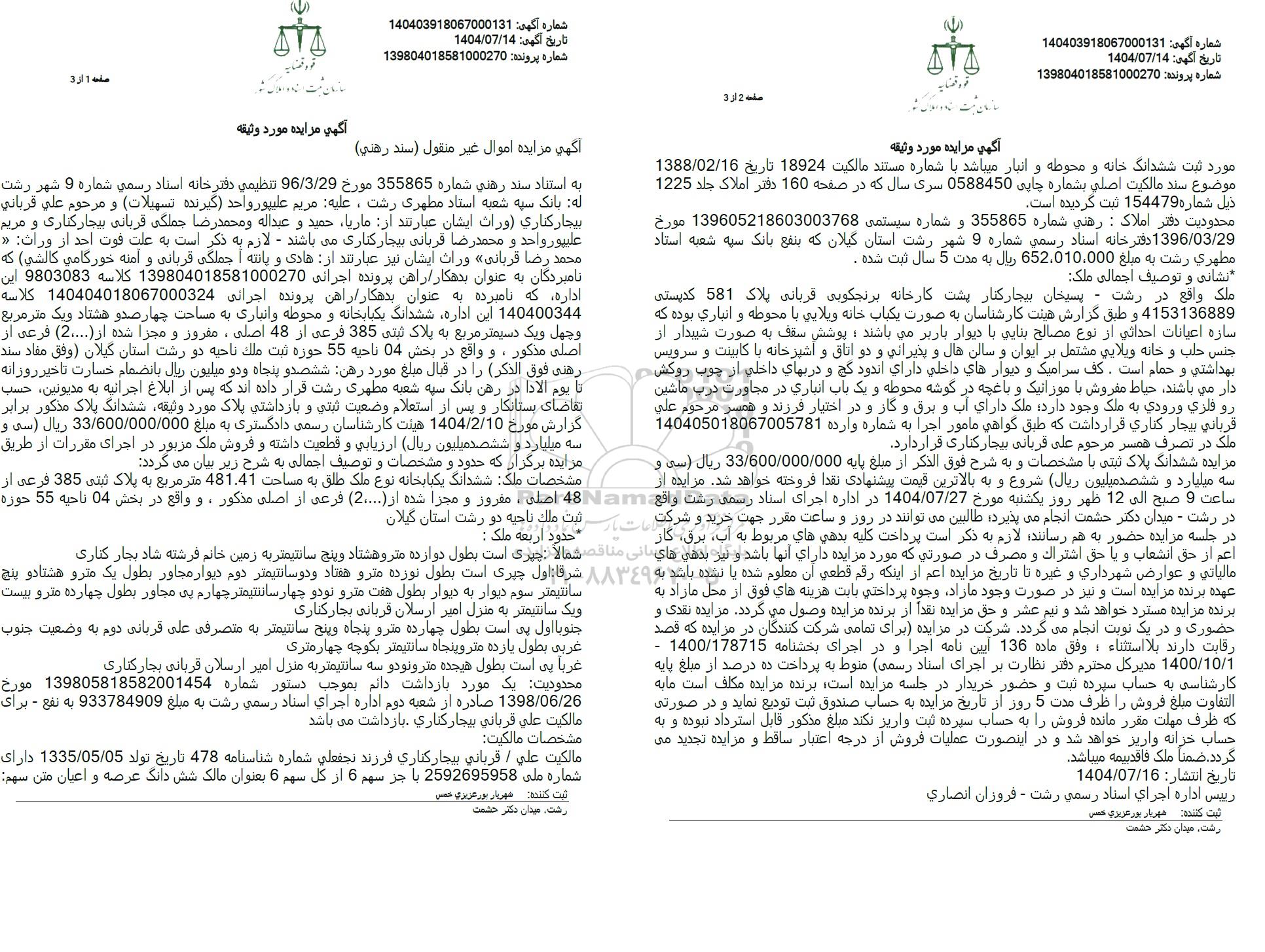به استناد سند رهني شماره 355865 مورخ 96.3.29 تنظيمي دفترخانه اسناد رسمی شماره 9 شهر رشت له بانک سپه شعبه استاد مطهری رشت، علیه مریم علیپور واحد گیرنده تسهیلات و مرحوم علي قرباني بیجار کناری وراث ایشان عبارتند از: ماریا حمید و عبداله و محمدرضا جملگی قربانی بیجار کناری و مریم و مریم علیپور واحد و محمدرضا قربانی بیجار کناری میباشند - لازم به ذکر است به علت فوت احد از ورات « محمد رضا قربانی وراث ایشان نیز عبارتند از هادی و پانته | جملگی قربانی و امنه خورگامی کالشی که نامبردگان به عنوان بدهکار . راهن پرونده اجرائی 139804018581000270 کلاسه 9803083 این اداره که نامبرده به عنوان بدهکار . راهن پرونده اجرائی 140404018067000324 كلاسه 140400344 این اداره ششدانگ یکبابخانه و محوطه و انباری به مساحت چهار صدو هشتاد و یک متر مربع و جهل و یک دسیمتر مربع به پلاک ثبتی 385 فرعی از 48 اصلی، مفروز و مجزا شده از (....2) فرعی از اصلی مذکور، و واقع در بخش 04 ناحيه 55 حوره ثبت ملک ناحیه دو رشت استان گیلان وفق مفاد سند رهنی فوق الذکر را در قبال مبلغ مورد رهن ششصد و پنجاه و دو میلیون ریال بانضمام خسارت تاخیر روزانه تا یوم الادا در رهن بانک سپه شعبه مطهری رشت قرار داده اند که پس از ابلاغ اجرائیه به مدیونین، حسب تقاضای بستانکار و پس از استعلام وضعیت ثبتی و بازداشتی پلاک مورد وثیقه ششدانگ پلاک مذکور برابر گزارش مورخ 1404.2.10 هیئت کارشناسان رسمی دادگستری به مبلغ 33.600.000.000 ریال سی و سه میلیارد و ششصد میلیون ریال ارزیابی و قطعیت داشته و فروش ملک مزبور در اجرای مقررات از طریق