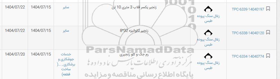 | TPC-6338-14040120 | زغال سنگ پروده طبس | زنجیر گالوانیزه 32*8 | سایر | 1404.7.15 | 1404.7.22 |