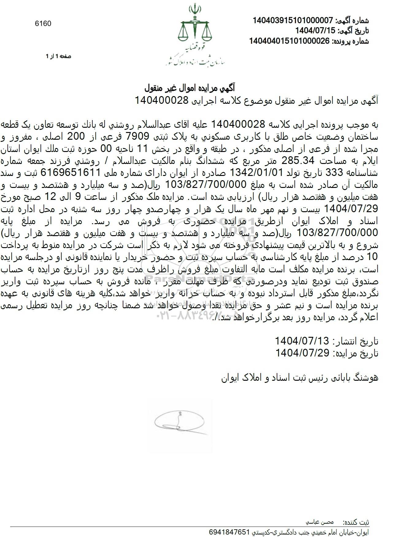 به موجب پرونده اجرایی کلاسه 140400028 علیه آقای عبدالسلام روشني له بانک توسعه تعاون یک قطعه ساختمان وضعیت خاص طلق با کاربری مسکونی به پلاک ثبتی 7909 فرعی از 200 اصلی ، مفروز و مجزا شده از فرعی از اصلی مذکور، در طبقه و واقع در بخش 11 ناحيه 00 حوزه ثبت ملک ایوان استان ایلام به مساحت 285.34 متر مربع که ششدانگ بنام مالکیت عبدالسلام . روشني فرزند جمعه شماره شناسنامه 333 تاریخ تولد 1342.01.01 صادره از ایوان دارای شماره ملی 6169651611 ثبت و سند مالکیت آن صادر شده است به مبلغ 103.827.700.000 ريال صد و سه میلیارد و هشتصد و بیست و هفت میلیون و هفتصد هزار ریال ارزیابی شده است. مزایده ملک مذکور از ساعت 9 الى 12 صبح مورخ 1404.07.29 بیست و نهم مهر ماه سال یک هزار و چهار صد و چهار روز سه شنبه در محل اداره ثبت اسناد و املاک ایوان از طریق مزایده حضوری به فروش می رسد. مزایده از مبلغ پایه 103.827.700.000 ریال (صد و سه میلیارد و هشتصد و بیست و هفت میلیون و هفتصد هزار ریال )شروع و به بالاترین قیمت پیشنهادی فروخته میشود لازم به ذکر است شرکت در مزایده منوط به پرداخت 10 درصد از مبلغ پایه کارشناسی به حساب سپرده ثبت و حضور خریدار یا نماینده قانونی او در جلسه مزایده است برنده مزایده مکلف است مابه التفاوت مبلغ فروش را ظرف مدت پنج روز از تاریخ مزایده به حساب صندوق ثبت تودیع نماید و در صورتی که ظرف مهلت مقرر ، مانده فروش به حساب سپرده ثبت واریز نگردد مبلغ مذکور قابل استرداد نبوده و به حساب خزانه واریز خواهد شد کلیه هزینه های قانونی به عهده برنده مزایده است و نیم عشر و حق مزایده نقدا وصول خواهد شد ضمنا چنانچه روز مزایده تعطیل رسمی اعلام گردد مزایده روز بعد برگزار خواهد شد.