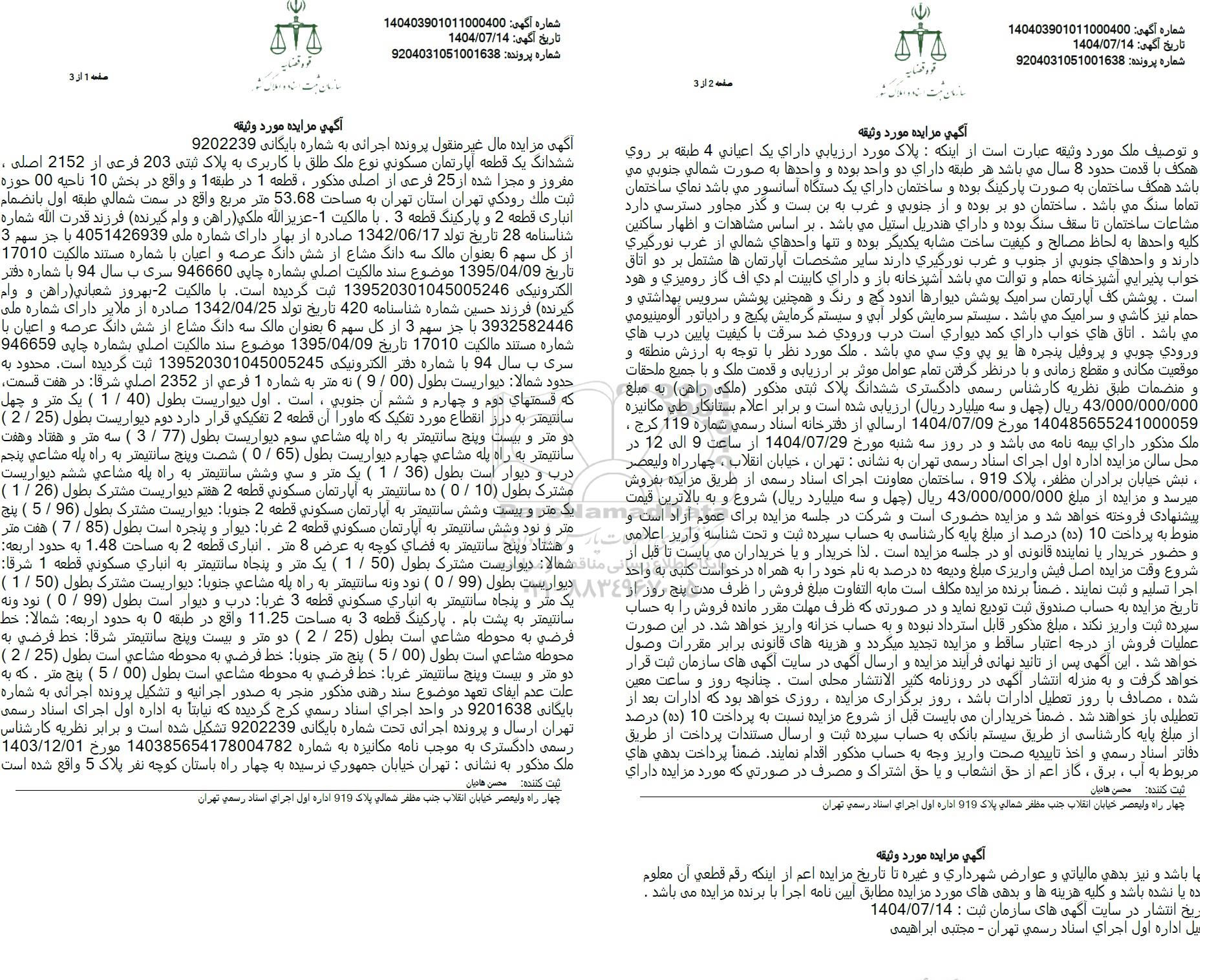 مزایده فروش ششدانگ یک دستگاه آپارتمان مسکونی به پلاک ثبتی 203 فرعی از 2152 اصلی به مساحت 53.68 متر مربع واقع در سمت شمالی طبقه اول به انضمام انباری قطعه 2 و پارکینگ قطعه 3