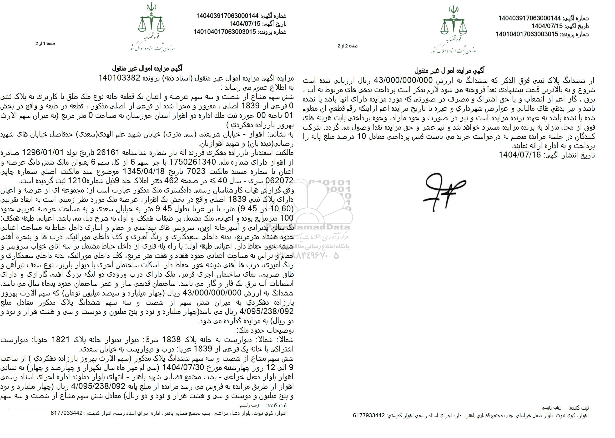 وفق گزارش هیات کارشناسان رسمی دادگستری ملک مذکور عبارت است از مجموعه ای از عرصه و اعیان دارای پلاک ثبتی 1839 اصلی واقع در بخش یک اهوار عرصه ملک مورد نظر زمینی است به ابعاد تقریبی (10.60 در 9.45) متر با بر غربا بطول 9.45 متر به خیابان سعدی و به مساحت عرصه تقریبی حدود 100 متر مربع بوده و اعیانی ملک مشتمل بر طبقات همکف و اول به شرح ذیل میباشد. اعیانی طبقه همکف یک سالن پذیرایی و آشپزخانه اوین سرویسهای بهداشتی و حمام و انباری داخل حیاط به مساحت اعیانی حدود هشتاد متر مربع بدنه داخلی سفیدکاری و رنگ امیزی و کف داخلی موزائیک درب ها و پنجره آهنی شیشه خور حفاظ دار اعیانی طبقه اول با راه پله فلزی از داخل حیاط مشتمل بر سه اتاق خواب سرویس و حمام و تراس به مساحت اعیانی حدود هفتاد و هفت متر مربع کف داخلی موزاتیک بدنه داخلی سفیدکاری و رنگ امیزی دربها اهنی شیشه خور حفاظ دار اسکلت ساختمان اجری با دیوار باربر، نوع سقف تیراهن و طاق ضربی نمای ساختمان آجری قرمز ملک دارای درب ورودی دو لنگه بزرگ آهنی گارازی و دارای انشعابات آب برق تک فاز و کار میباشد. ساختمان قدیمی ساز و عمر ساختمان حدود پنجاه سال می باشد. ششدانگ به ارزش 43.000.000.000 ریال چهار میلیارد و سیصد میلیون تومان که سهم الارث بهروز یارزاده دهکردی به میزان شش سهم از شصت و سه سهم ششدانگ پلاک مذکور معادل مبلغ 4.095.238.092 ریال می باشد چهار میلیارد و نود و پنج میلیون و دویست و سی و هشت هزار و نود و دو ریال به مزایده گذارده می شود.
