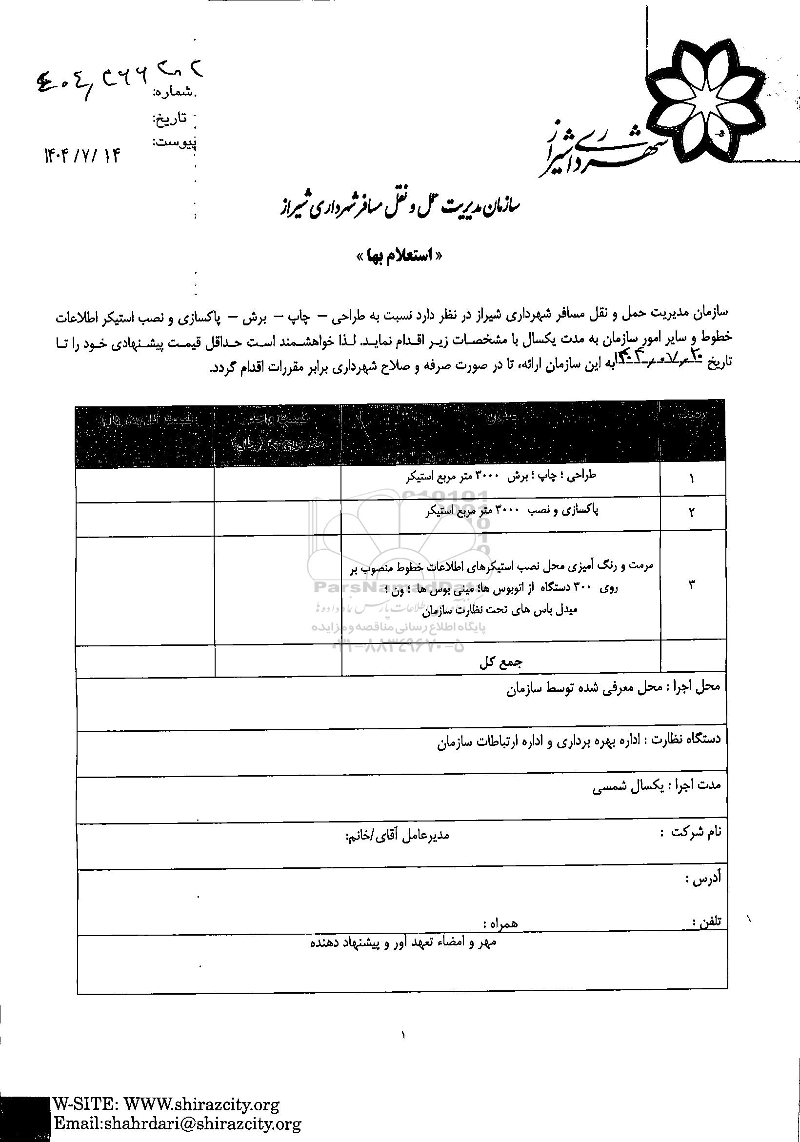 سازمان مدیریت حمل و نقل مسافر شهرداری شیراز در نظر دارد نسبت به طراحی - چاپ - برش - پاکسازی و نصب استیکر اطلاعات خطوط و سایر امور سازمان به مدت یکسال با مشخصات زیر اقدام نماید. لذا خواهشمند است حداقل قیمت پیشنهادی خود را تا تاریخ 1404.07.20 به این سازمان ارائه تا در صورت صرفه و صلاح شهرداری برابر مقررات اقدام گردد.
