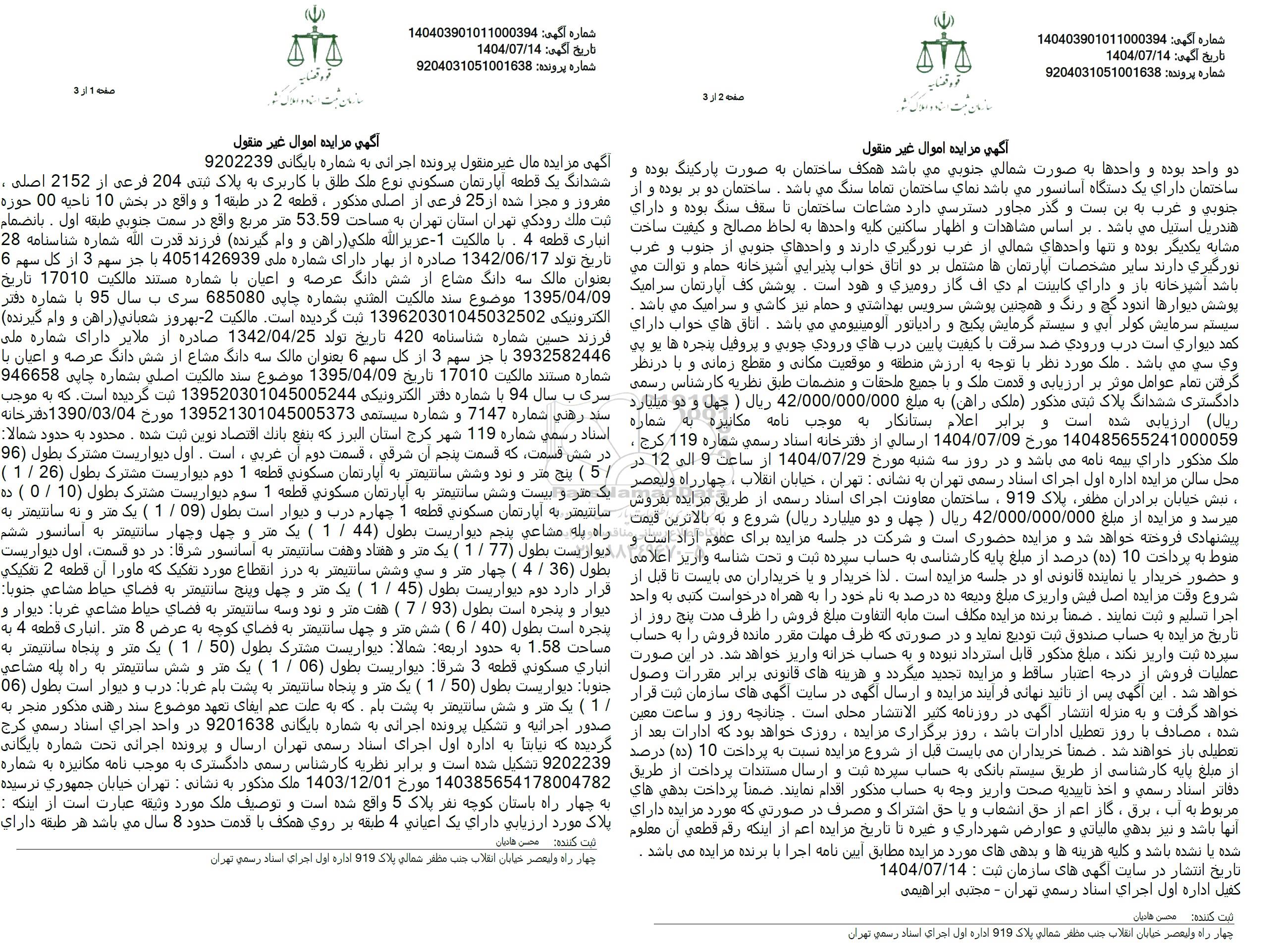 آگهی مزایده مال غیر منقول پرونده اجرائی به شماره بایگانی 9202239 ششدانگ یک قطعه آپارتمان مسکونی نوع ملک طلق با کاربری به پلاک ثبتی 204 فرعی از 2152 اصلی . مفروز و مجرا شده از 25 فرعی از اصلی مذکور ، قطعه 2 در طبقه 1 و واقع در بخش 10 ناحیه 00 حوزه ثبت ملک رودکی تهران استان تهران به مساحت 53.59 متر مربع واقع در سمت جنوبی طبقه اول . بانضمام انباری قطعه 4 . با مالکیت -1 - عزیز الله ملکی راهن و وام گیرنده فرزند قدرت الله شماره شناسنامه 28 تاریخ تولد 1342.06.17 صادره از بهار دارای شماره ملی 4051426939 با جر سهم 3 از کل سهم 6 بعنوان مالک سه دانگ مشاع از شش دانگ عرصه و اعیان با شماره مستند مالکیت 17010 تاریخ 1395.04.09 موضوع سند مالكیت المتنی بشماره جایی 685080 سری به سال 95 با شماره دفتر الکترونیکی 139620301045032502 ثبت گردیده است. مالکیت -2 بهروز شعبانی (راهن و وام گیرنده) فرزند حسین شماره شناسنامه 420 تاریخ تولد 1342.04.25 صادره از ملایر دارای شماره ملی 3932582446 با جر سهم 3 از کل سهم 6 بعنوان مالک سه دانگ مشاع از شش دانگ عرصه و اعیان با شماره مستند مالکیت 17010 تاریخ 1395.04.09 موضوع سند مالکیت اصلی بشماره چاپی 946658 سری به سال 94 با شماره دفتر الکترونیکی 139520301045005244 ثبت گردیده است. که به موجب سند رهنی شماره 7147 و شماره سیستمی 139521301045005373 مورخ 1390.03.04 دفتر خانه اسناد رسمی شماره 119 شهر کرج استان البرز که بنفع بانک اقتصاد نوین ثبت شده. محدود به حدود شمالا در شش قسمت که قسمت پنجم آن شرقی ، قسمت دوم آن غربی ، است . اول دیوار بست مشترک بطول (96) . 5 ) پنج متر و نود و شش سانتیمتر به آپارتمان مسکونی قطعه 1 دوم دیواریست مشترك بطول (26 . 1 ) یک متر و بیست و شش سانتیمتر به آپارتمان مسكونی قطعه 1 سوم دیواریست مشترک بطول (10) . 0 ) ده سانتیمتر به آپارتمان مسکونی قطعه 1 چهارم درب و دیوار است بطول (09 . 1 ) یک متر و به سانتیمتر به راه پله مشاعی پنجم دیواریست بطول (44) . 1 ) یک متر و چهل و چهار سانتیمتر به آسانسور ششم دیواریست بطول (1.77 ) یک متر و هفتاد و هفت سانتیمتر به آسانسور شرقا در دو قسمت اول دیواریست بطول (36) . 4 ) چهار متر و سی وشش سانتیمتر به درز انقطاع مورد تفکیک که ماورا آن قطعه 2 تفکیکی قرار دارد دوم دیواریست بطول (1.45 ) یک متر و چهل و پنج سانتیمتر به فضای حیاط مشاعی جنوبا: دیوار و پنجره است بطول (7.93 ) هفت متر و نود و سه سانتیمتر به فضای حیاط مشاعی غربا: دیوار و پنجره است بطول (6.40 ) شش متر و چهل سانتیمتر به فضای کوچه به عرض 8 متر انباری قطعه 4 به مساحت 1.58 به حدود اربعه شمالا دیواریست مشترك بطول 50 . 1 ) یک متر و پنجاه سانتیمتر به انباری مسکونی قطعه 3 شرقا دیواریست بطول (06. 1 ) یک متر و شش سانتیمتر به راه پله مشاعی جنوبا دیواریست بطول (50 . 1 ) یک متر و پنجاه سانتیمتر به پشت بام غربا درب و دیوار است بطول (06) . 1 ) یک متر و شش سانتیمتر به پشت بام که به علت عدم ایفای تعهد موضوع سند رهنی مذکور منجر به صدور اجرائیه و تشکیل پرونده اجرائی به شماره بایگانی 9201638 در واحد اجرای اسناد رسمی کرج گردیده که نیابتا به اداره اول اجرای استاد رسمی تهران ارسال و پرونده اجرانی تحت شماره بایگانی 9202239 تشکیل شده است و برابر نظریه کارشناس رسمی دادگستری به موجب نامه مکانیزه به شماره 140385654178004782 مورخ 1403.12.01 ملک مذکور به نشانی : تهران خیابان جمهوری نرسیده به چهار راه باستان کوچه نفر پلاک 5 واقع شده است و توصیف ملک مورد وثیقه عبارت است از اینکه : پلاک مورد ارزیابی دارای یک اعیانی 4 طبقه بر روی همکف با قدمت حدود 8 سال می باشد هر طبقه دارای دو واحد بوده و واحدها به صورت شمالی جنوبی می باشد همکف ساختمان به صورت پارکینگ بوده و ساختمان دارای یک دستگاه آسانسور میباشد نمای ساختمان تماما سنگ میباشد. ساختمان دو بر بوده و از جنوبی و عرب به بن بست و گذر مجاور دسترسی دارد مشاعات ساختمان تا سقف سنگ بوده و دارای هندریل استیل می باشد. بر اساس مشاهدات و اظهار ساکنین کلیه واحدها به لحاظ مصالح و کیفیت ساخت مشابه یکدیگر بوده و تنها واحدهای شمالی از غرب نورگیری دارند و واحدهای جنوبی از جن