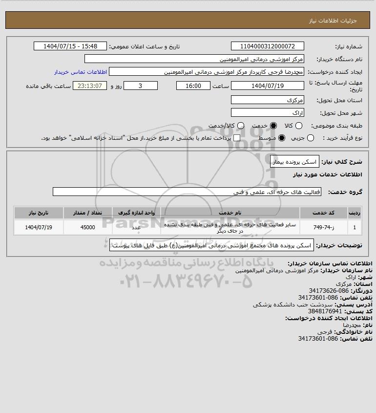 استعلام بها و موضوع استعلام استعلام اسکن پرونده بیمار به اطلاع کلیه شرکتها و افراد متخصص واجد شرایط میرساند، آگهی گذار در نظر دارد از طریق استعلام بها، نسبت به انتخاب و دریافت پیشنهادات اقدام نماید. این استعلام با کد آگهی ثبت شده در سامانه خبرگزاری پارس نماد : 9663118 منتشر شده است. مشخصات استعلام : تاریخ شروع استعلام: 1404/07/15 آخرین مهلت ارسال پیشنهاد قیمت : 1404/07/19 و محل اجرای پروژه : استان مرکزی میباشد. استعلام قیمت مورد درخواست : استعلام اسکن پرونده بیمار با دستهبندیهای تخصصی و گروه های مرتبط : تامین نیروی انسانی, تایپ و پانچ و خدمات اداری, کامپیوتر, اتوماسیون اداری, استعلام اطلاع رسانی میگردد.