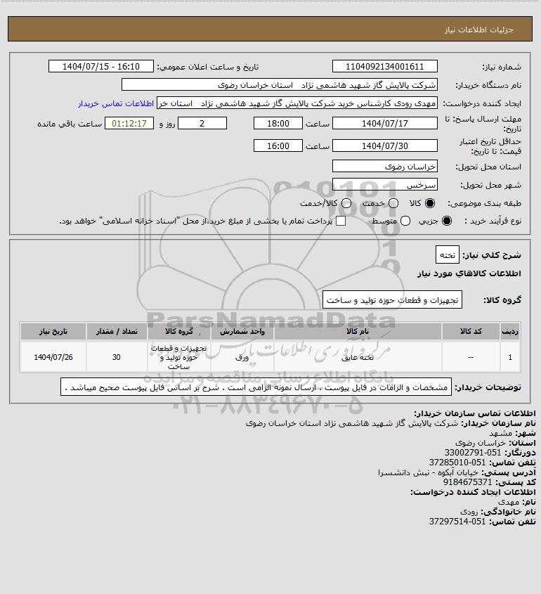 نام دستگاه خریدار:شرکت پالایش گاز شهید هاشمی نژاد استان خراسان رضوی