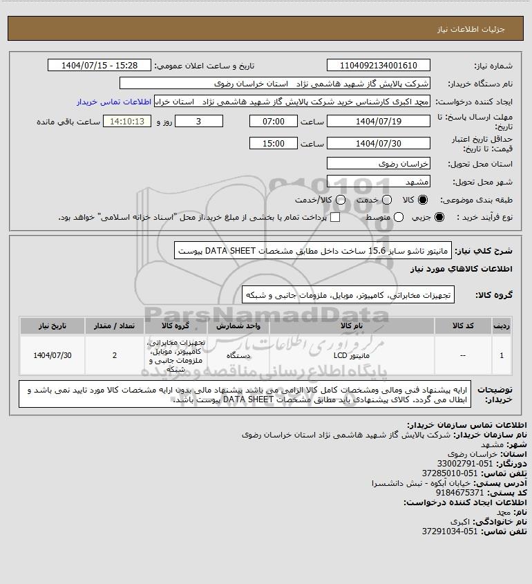 شرح کلی نیاز: مانیتور تاشو سایز 15.6 ساخت داخل مطابق مشخصات DATA SHEET پیوست