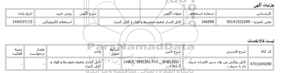 علی ناصرنیا - 05141522299166599کابل فشار ضعیف،متوسط و قوی و کابل کنترلاستعلام الکترونیکی1404/07/15