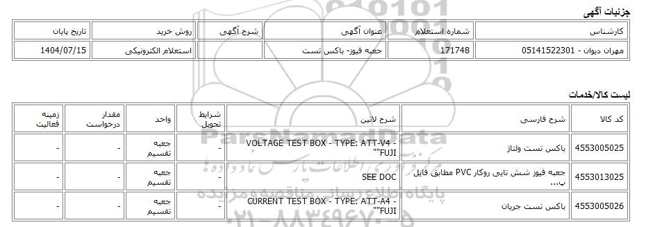 مهران دیوان - 05141522301 | 171748 | جعبه فیوز- باکس تست | استعلام الکترونیکی | 1404/07/15 |
