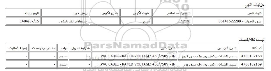 علی ناصرنیا - 05141522299 | 171570 | سیم | استعلام الکترونیکی | 1404/07/15 |