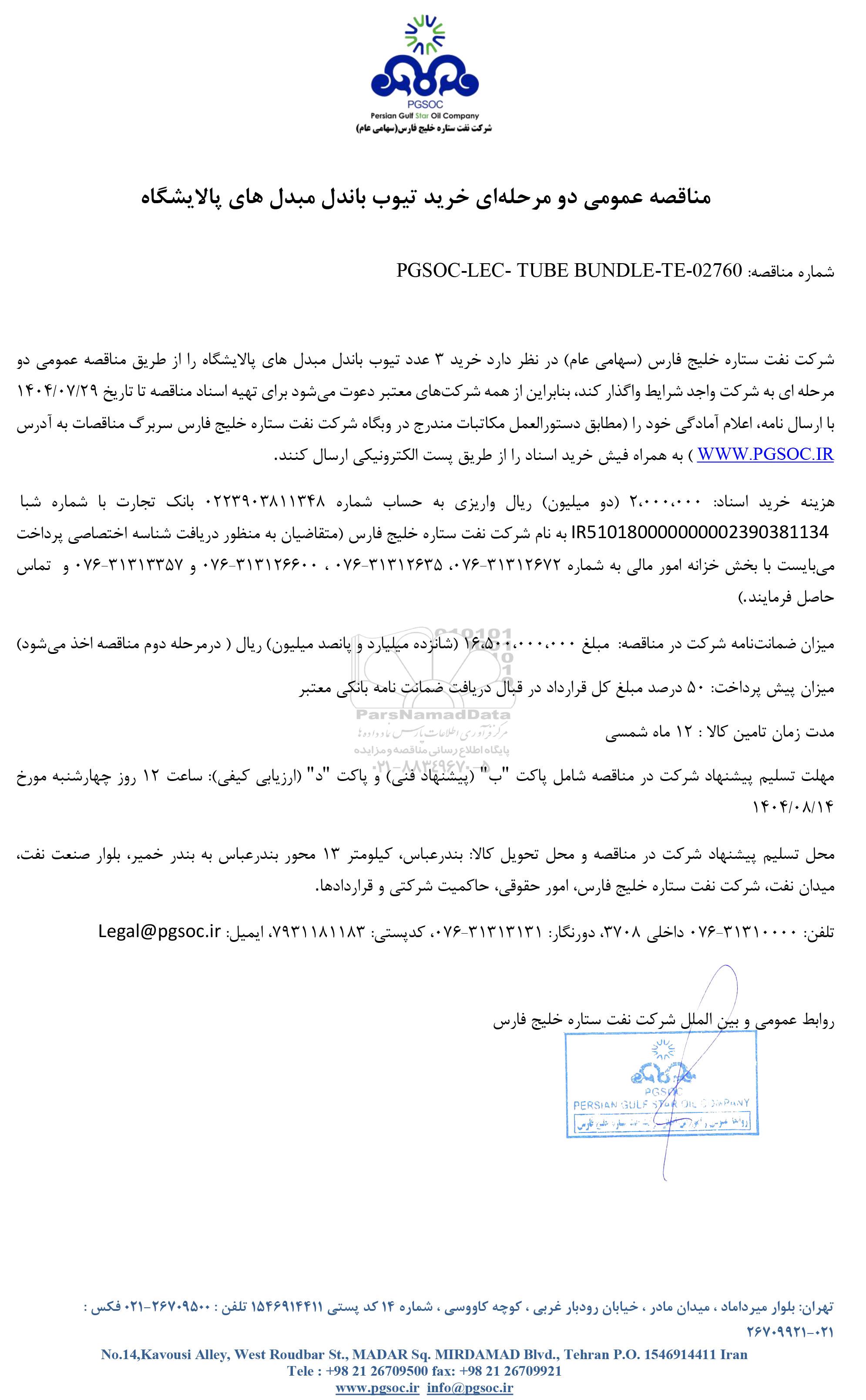 شماره مناقصه: PGSOC-LEC- TUBE BUNDLE-TE- 02760