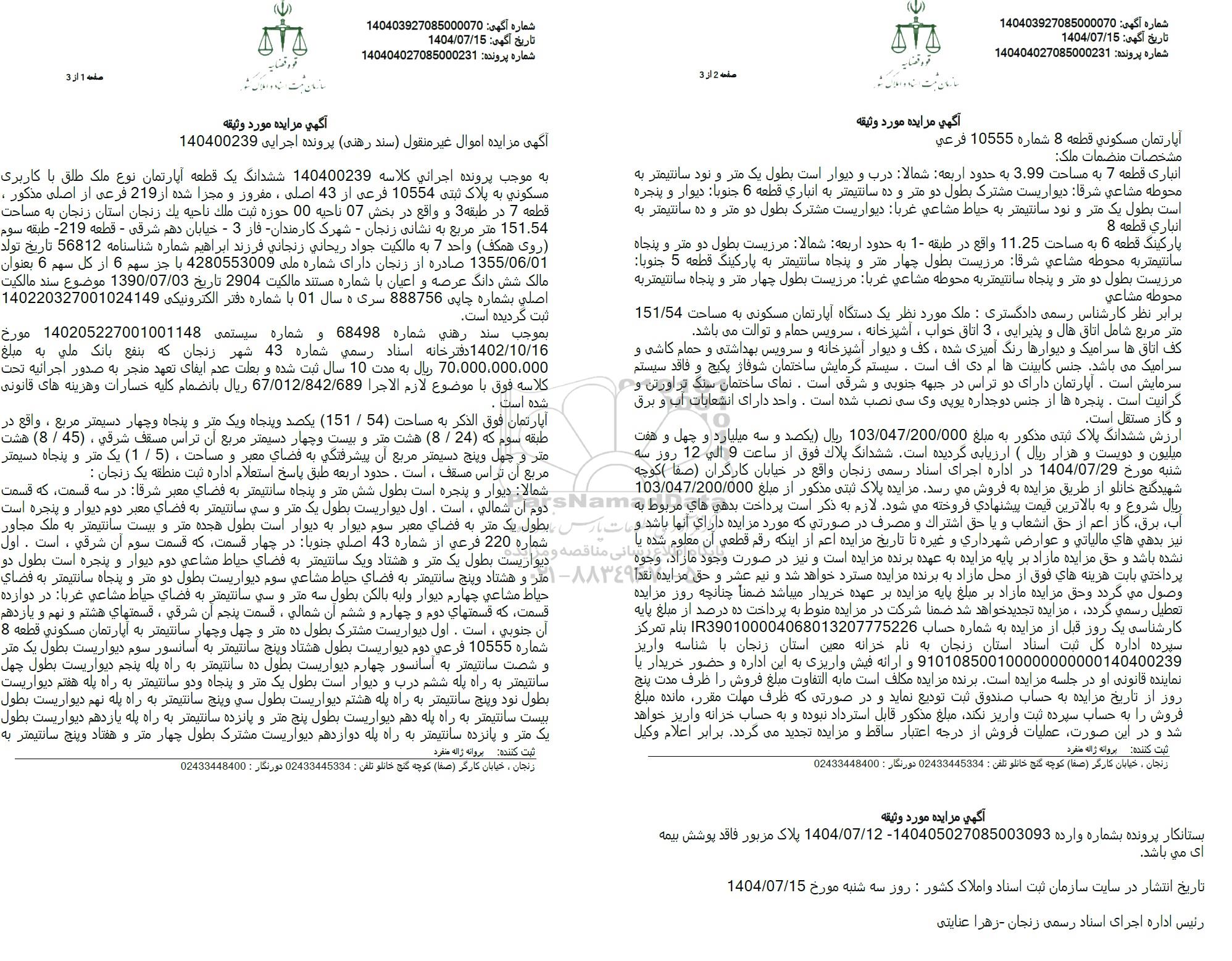 به موجب پرونده اجرائی کلاسه 140400239 ششدانگ یک قطعه آپارتمان نوع ملک طلق با کاربری مسکونی به پلاک ثبتی 10554 فرعی از 43 اصلی، مغرور و مجزا شده از 219 فرعی از اصلی مذکور ، قطعه 7 در طبقه 3 و واقع در بخش 07 ناحيه 00 حوزه ثبت ملک ناحيه يک زنجان استان زنجان به مساحت 151.54 متر مربع به نشانی زنجان - شهرک کارمندان فاز 3 - خیابان دهم شرقی - قطعه 219 - طبقه سوم روی همکف واحد 7 به مالکیت جواد ريحاني رنجانی فرزند ابراهیم شماره شناسنامه 56812 تاریخ تولد 1355.06.01 صادره از زنجان دارای شماره ملی 4280553009 با جز سهم 6 از کل سهم 6 بعنوان مالک شش دانگ عرصه و اعیان با شماره مستند مالکیت 2904 تاريخ 1390.07.03 موضوع سند مالکيت اصلي بشماره چایی 888756 سری 5 سال 01 با شماره دفتر الکترونیکی 140220327001024149 ثبت گردیده است.پ