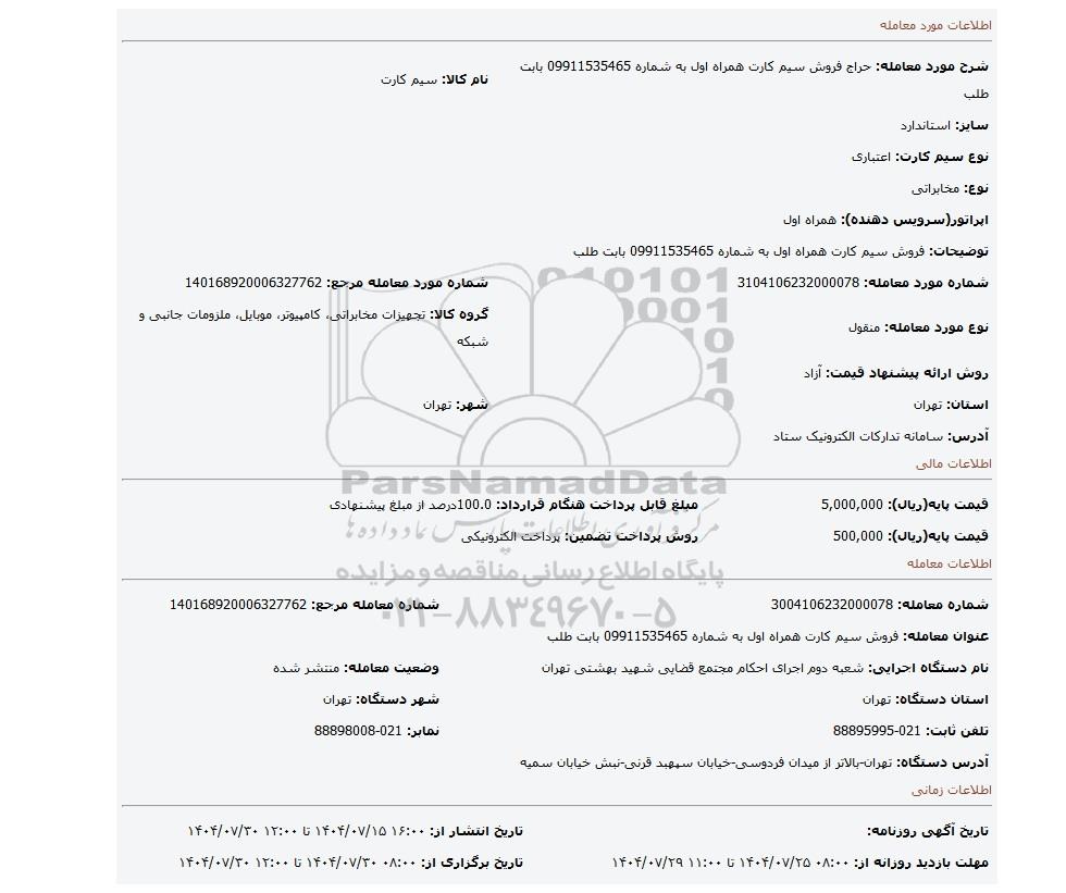 | عنوان معامله: فروش سیم کارت همراه اول به شماره 09911535465 بابت طلب | ||