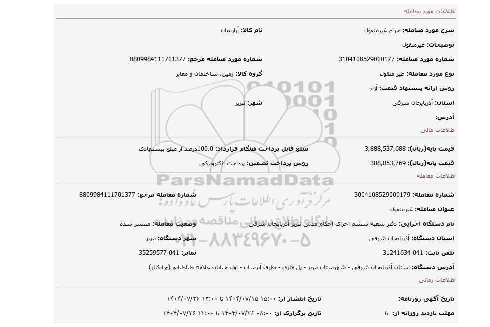 10 مزایده ششدانگ یک قطعه آپارتمان مسکونی نوع ملک طلق پلاک ثبتی 186 فرعی از 5792 اصلی 9808347 1404/08/14 new not special not payed آذربایجان شرقی
