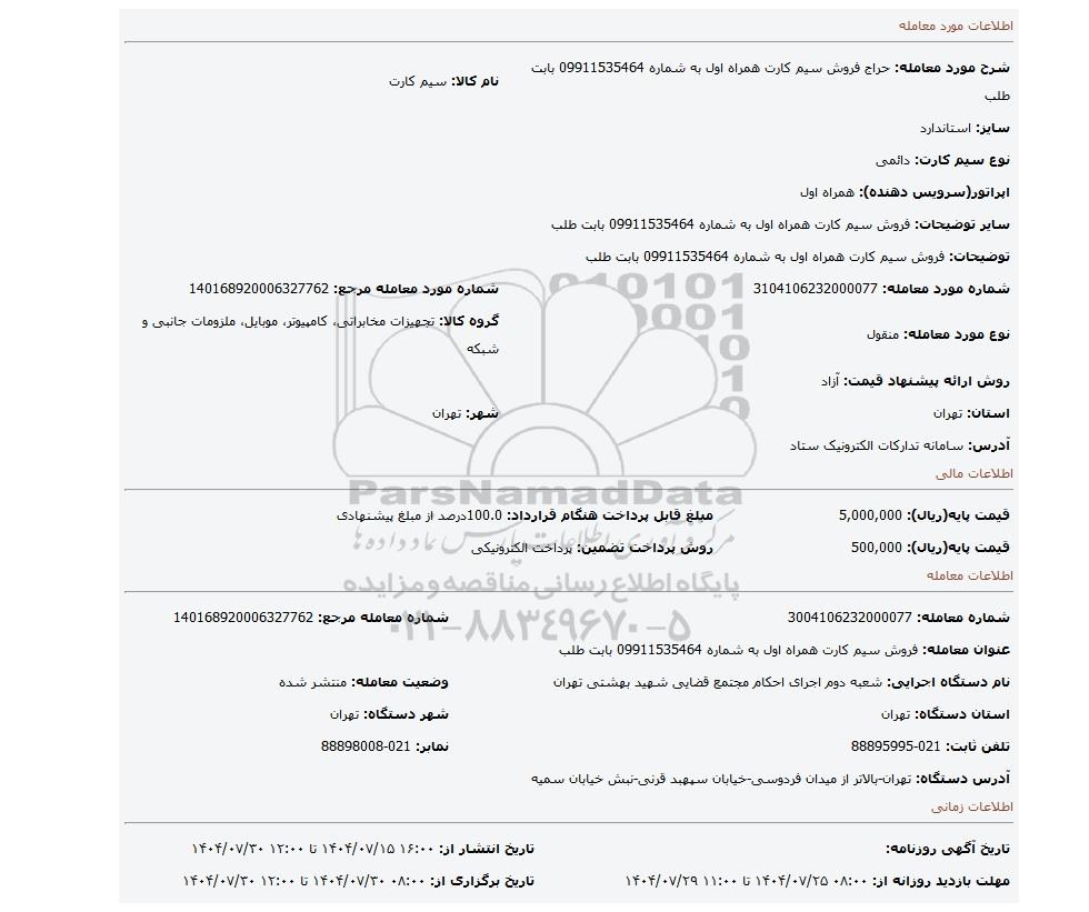 | عنوان معامله: فروش سیم کارت همراه اول به شماره 09911535464 بابت طلب | ||