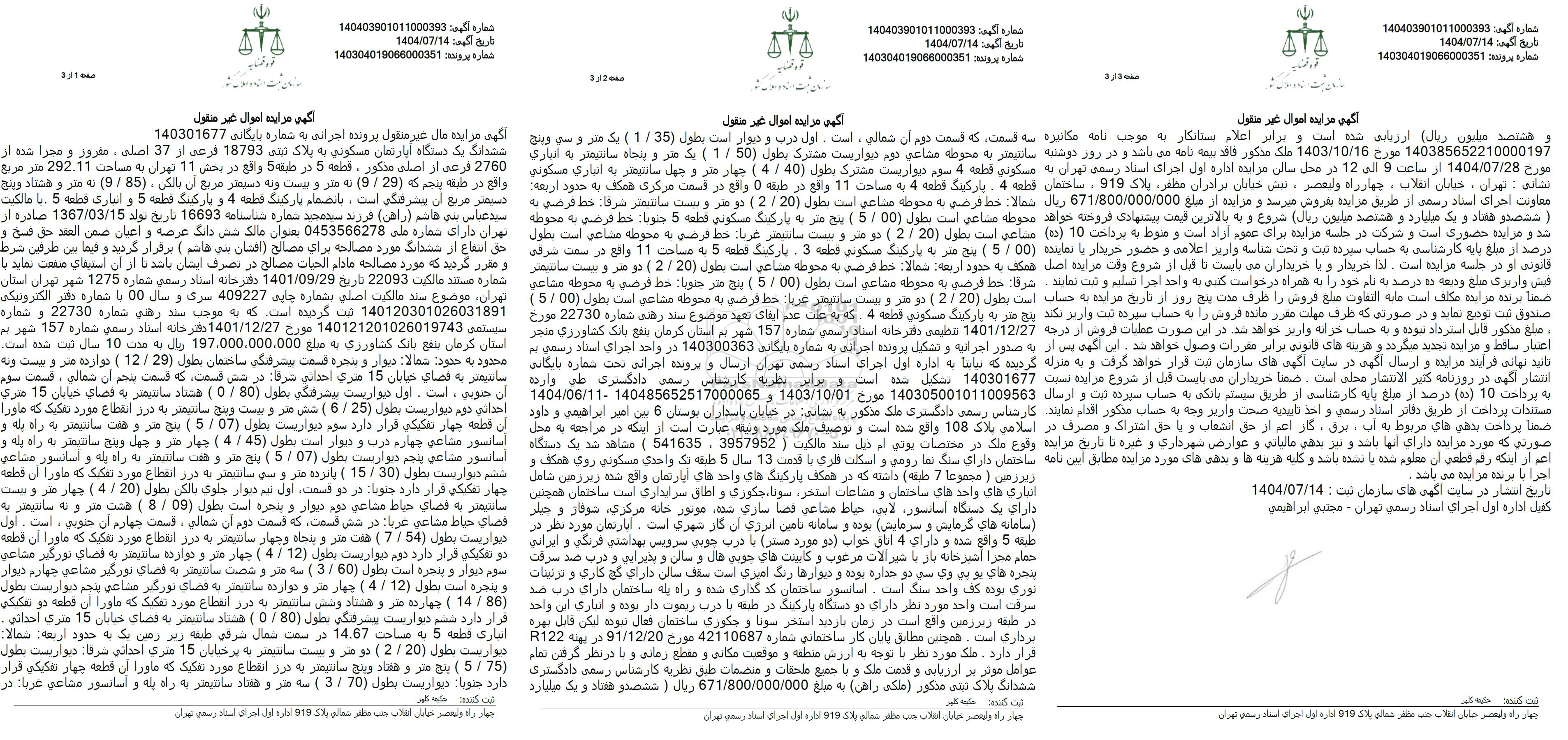 تاریخ مزایده ساعت 9 الی 12 روز دوشنبه مورخ 1404.07.28 در محل سالن مزایده اداره اول اجرای اسناد رسمی تهران به نشانی تهران - خیابان انقلاب - چهارراه ولیعصر - نبش برادران مظفر پلاک 919 - ساختمان معاونت اجرای اسناد رسمی