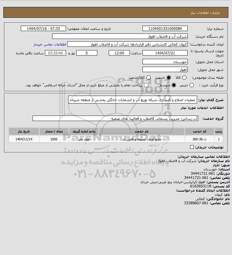 شرح کلی نیاز: عملیات اصلاح و بازسازی شبکه توزیع آب و انشعابات خانگی بخشی از منطقه شیبان