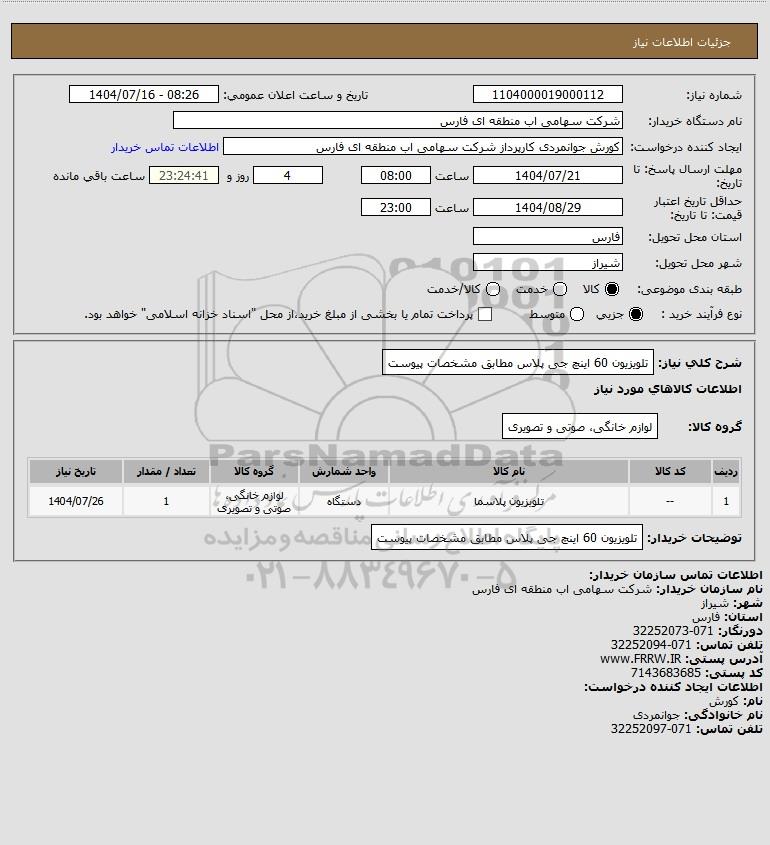 شرح کلی نیاز: تلویزیون 60 اینچ جی پلاس مطابق مشخصات پیوست