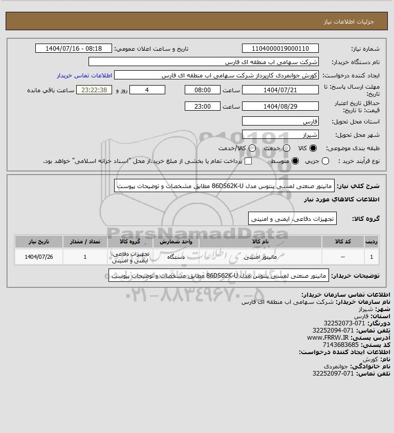 | 1 | -- | مانیتور امنیتی | دستگاه | تجهیزات دفاعی، ایمنی و امنیتی | 1 | 1404/07/26 |