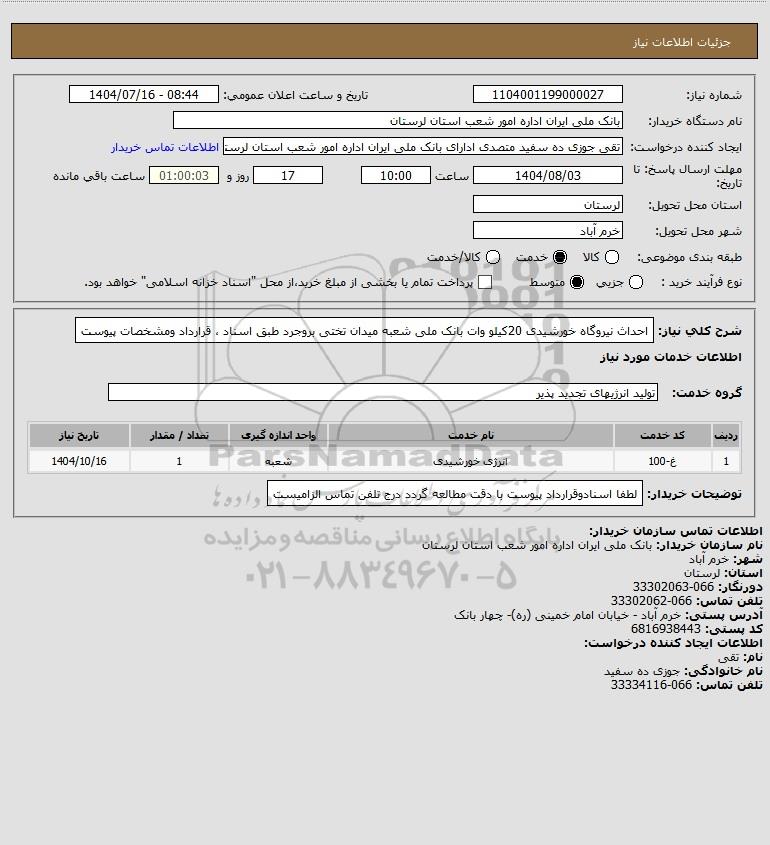 استعلام احداث نیروگاه خورشیدی 20کیلو وات بانک ملی شعبه میدان تختی بروجرد طبق اسناد قرارداد ومشخصات پیوست, استعلام احداث نیروگاه خورشیدی 20کیلو وات بانک ملی شعبه میدان تختی بروجرد طبق اسناد ، قرارداد ومشخصات پیوست