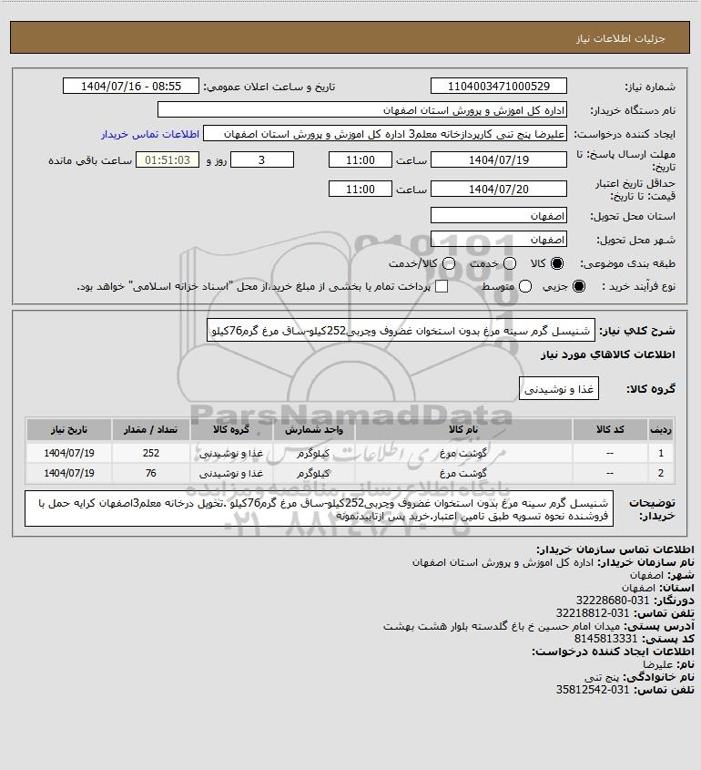 شرح کلی نیاز: شنیسل گرم سینه مرغ بدون استخوان غضروف وچربی252کیلو-ساق مرغ گرم76کیلو