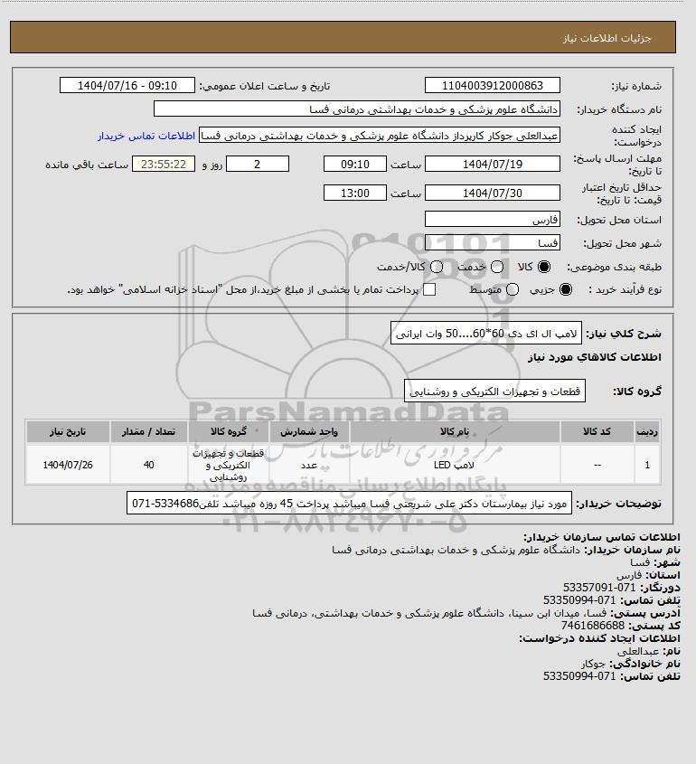 | 1 | -- | لامپ LED | عدد | قطعات و تجهیزات الکتریکی و روشنایی | 40 | 1404/07/26 |