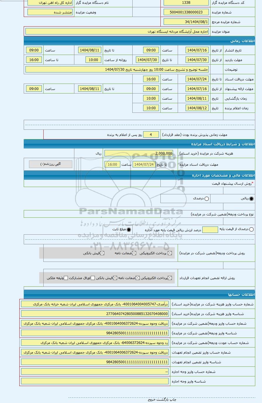 شماره حساب واریز هزینه شرکت در مزایده درآمدی-4001064004005747- بانک مرکزی جمهوری اسلامی ایران شعبه خزانه بانک مرکزی