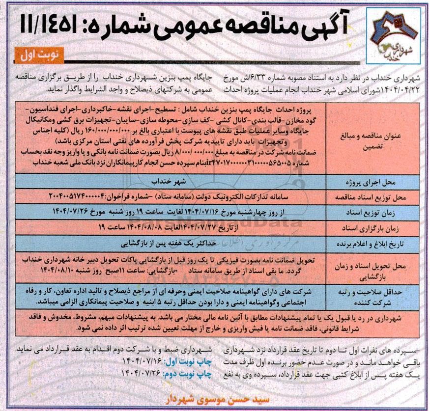 شهرداری خنداب در نظر دارد به استناد مصوبه شماره 6/33/ش مورخ 1404.4.22 شورای اسلامی شهر خنداب انجام عملیات پروژه احداث جایگاه پمپ بنزین شهرداری خنداب را از طریق برگزاری مناقصه عمومی به شرکتهای ذیصلاح و واجد الشرایط واگذار نماید.