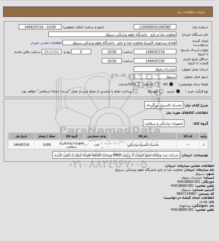 | 1 | -- | ماسک اکسیژن پزشکی | عدد | تجهیزات پزشکی و سلامت | 5,000 | 1404/07/19 |