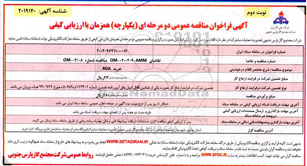 مناقصه خرید RGA نوبت دوم از کلیه افراد متخصص و شرکتها واجد شرایط دعوت به عمل میآید در مناقصه با کد خبرگزاری پارس نماد: 9666044 شرکت نمایند.
