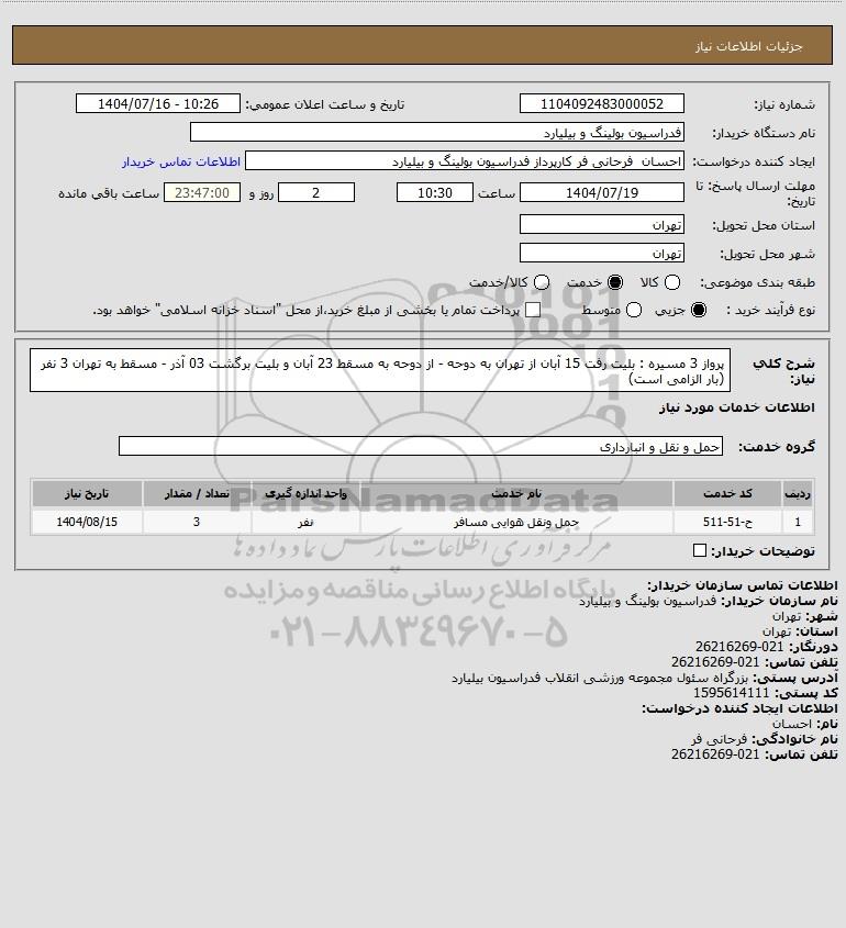 نام سازمان خریدار: فدراسیون بولینگ و بیلیارد