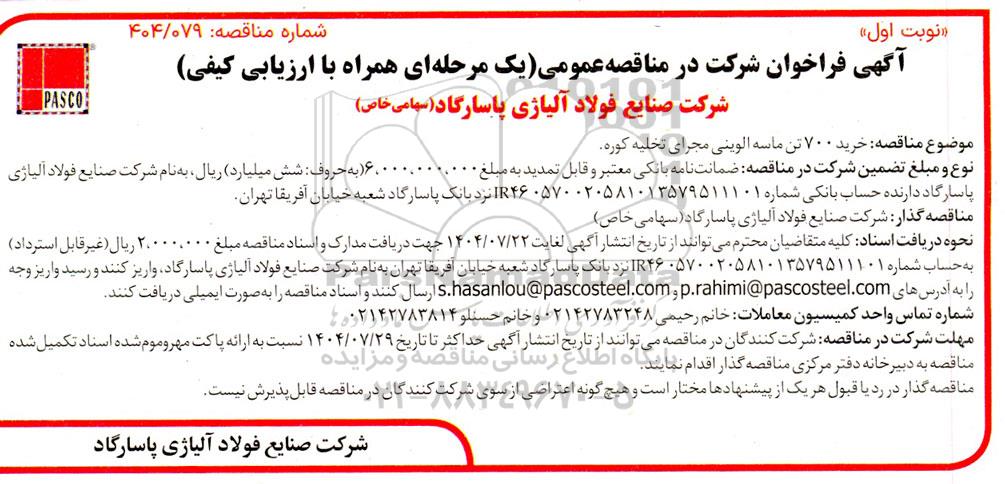 مناقصه گذار : شرکت صنایع فولاد آلیاژی پاسارگاد (سهامی خاص)