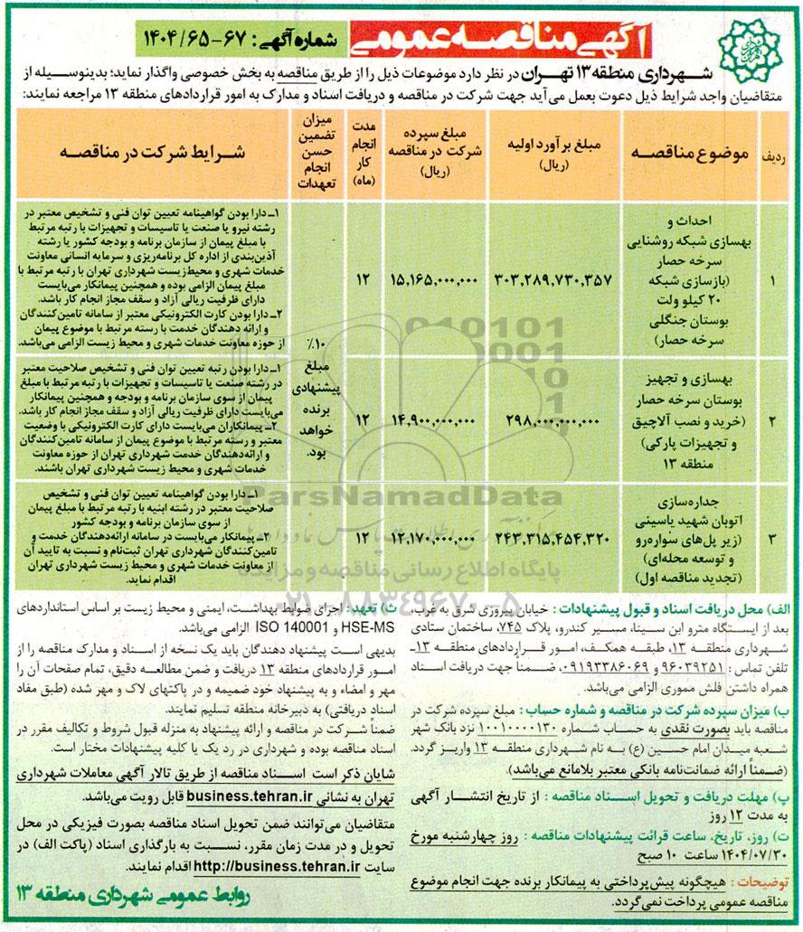 1 احداث و بهسازی شبکه روشنایی سرخه حصار (بازسازی شبکه 20 کیلو ولت بوستان جنگلی سرخه حصار) 303.289.730.357 15.165.000.000 12 10%  مبلغ پیشنهادی برنده خواهد بود. 1. دارا بودن گواهینامه تعیین توان فنی و تشخیص معتبر در رشته نیرو یا صنعت یا تاسیسات و تجهیزات با رتبه مرتبط با مبلغ پیمان از سازمان برنامه و بودجه کشور یا رشته آذین بندی از اداره کل برنامه ریزی و سرمایه انسانی معاونت خدمات شهری و محیط زیست شهرداری تهران با رتبه مرتبط با مبلغ پیمان الزامی بوده و همچنین پیمانکار میبایست دارای ظرفیت ریالی آزاد و سقف مجاز انجام کار باشد. 2. دارا بودن کارت الکترونیکی معتبر از سامانه تامین کنندگان و ارائه دهندگان خدمت با رسته مرتبط با موضوع پیمان از حوزه معاونت خدمات شهری و محیط زیست الزامی میباشد.