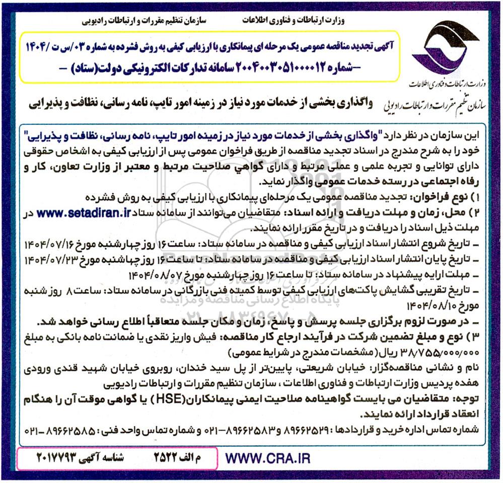 این سازمان در نظر دارد واگذاری بخشی از خدمات مورد نیاز در زمینه امور تایپ نامه رسانی، نظافت و پذیرایی خود را به شرح مندرج در اسناد تجدید مناقصه از طریق فراخوان عمومی پس از ارزیابی کیفی به اشخاص حقوقی دارای توانایی و تجربه علمی و عملی مرتبط و دارای گواهی صلاحیت مرتبط و معتبر از وزارت تعاون، کار و رفاه اجتماعی در رسته خدمات عمومی واگذار نماید.