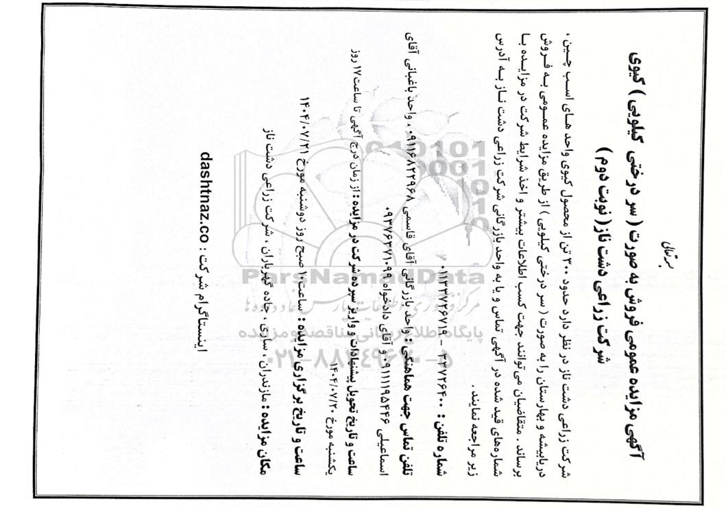 شرکت زراعی دشت ناز در نظر دارد حدود 300 تن از محصول کیوی واحدهای اسب چین، دریابیشه و بهارستان را به صورت (سر درختی کیلویی) از طریق مزایده عمومی به فروش برساند. متقاضیان می توانند جهت کسب اطلاعات بیشتر و اخذ شرایط شرکت در مزایده با شماره های قید شده در آگهی تماس و یا به واحد بازرگانی شرکت زراعی دشت ناز به آدرس زیر مراجعه نمایند.