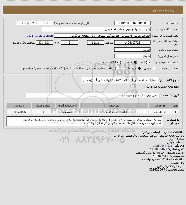شرح کلی نیاز: عملیات ساختمانی ایستگاه 66/20 کیلوولت علی آباد (پدافند)